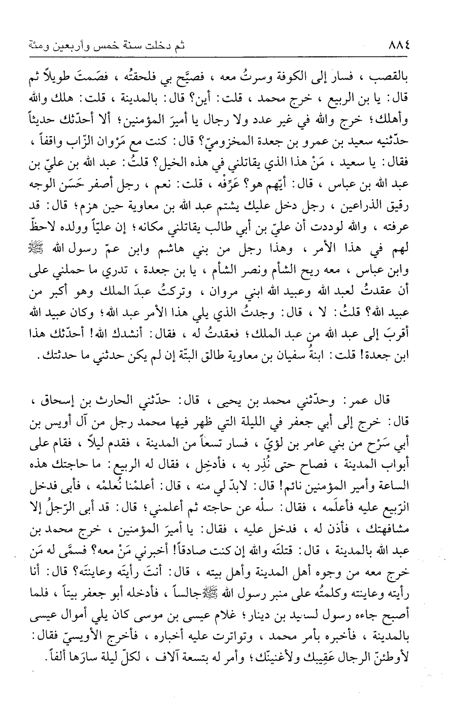 بالقصب، فسار إلى الكوفة وسرتُ معه، فصيَّح بي فلحقتُه، فصَمتَ طويلًا ثم قال: يا بن الربيع، خرج محمد، قلت: أين؟ قال: بالمدينة، قلت: هلك والله وأهلك؛ خرج والله في غير عدد ولا رجال يا أميرَ المؤمنين؛ ألا أحدّثك حديثًا حدّثنيه سعيد بن عمرو بن جعدة المخزوميّ؟ قال: كنت مع مَرْوان الزّاب واقفًا، فقال: يا سعيد، مَنْ هذا الذي يقاتلني في هذه الخيل؟ قلتُ: عبد الله بن عليّ بن عبد الله بن عباس، قال: أيّهم هو؟ عَرِّفْه، قلت: نعم، رجل أصفر حَسَن الوجه رقيق الذراعين، رجل دخل عليك يشتم عبد الله بن معاوية حين هزم؛ قال: قد عرفته، والله لوددت أن عليّ بن أبي طالب يقاتلني مكانه؛ إن عليّا وولده لاحظّ لهم في هذا الأمر، وهذا رجل من بني هاشم وابن عمّ رسول الله - صلى الله عليه وسلم - وابن عباس، معه ريح الشأم ونصر الشأم، يا بن جعدة، تدري ما حملني على أن عقدتُ لعبد الله وعبيد الله ابني مروان، وتركتُ عبدَ الملك وهو أكبر من عبيد الله؟ قلتُ: لا، قال: وجدتُ الذي يلي هذا الأمر عبد الله؛ وكان عبيد الله أقربَ إلى عبد الله من عبد الملك، فعقدتُ له، فقال: أنشدك الله! أحدّثك هذا ابن جعدة! قلت: ابنةُ سفيان بن معاوية طالق البتّة إن لم يكن حدثني ما حدتتك.