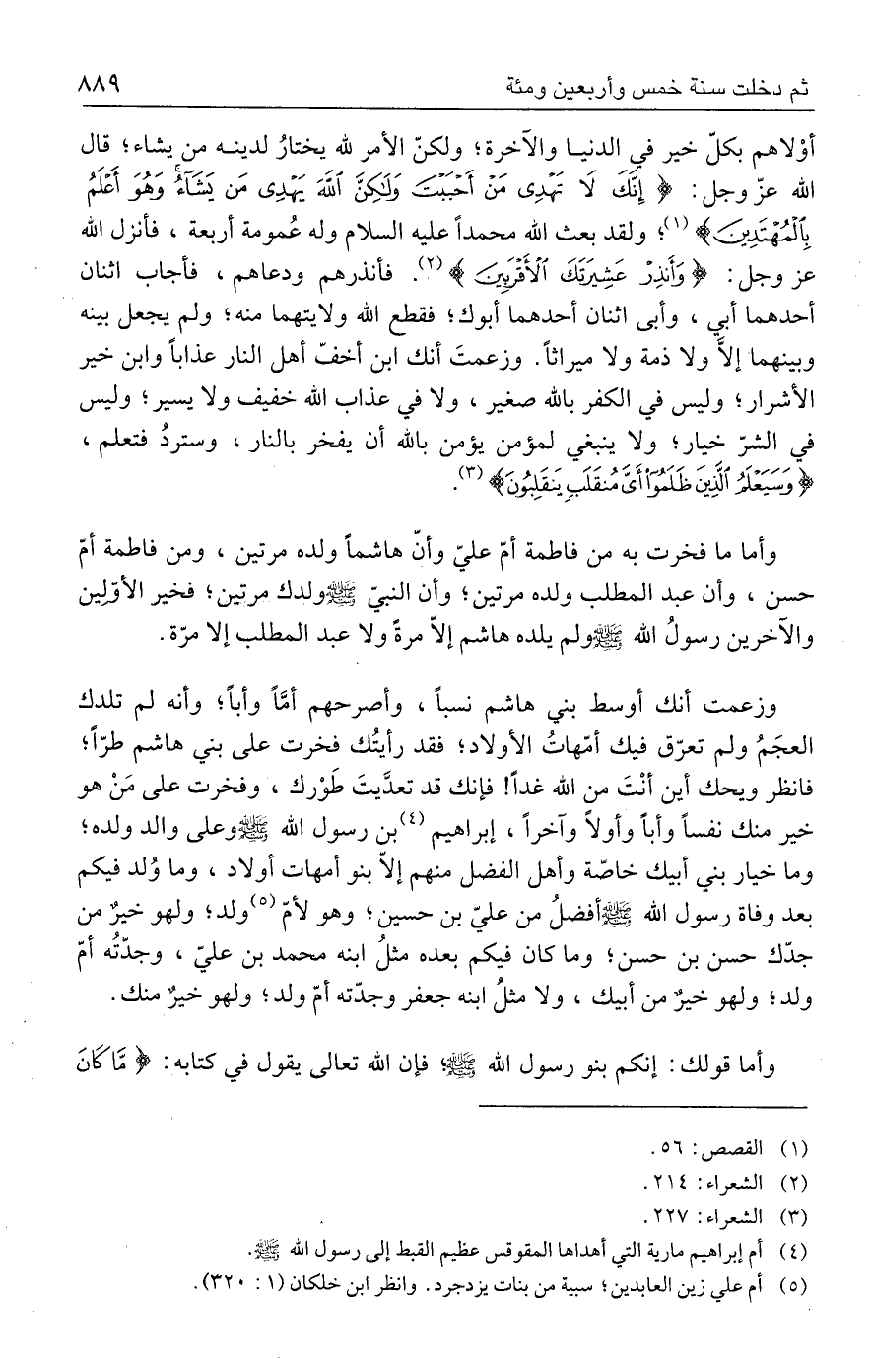 وأما ما فخرت به من فاطمة أمّ عليّ وأنّ هاشمًا ولده مرتين، ومن فاطمة أمّ حسن، وأن عبد المطلب ولده مرتين؛ وأن النبيّ - صلى الله عليه وسلم - ولدك مرتين؛ فخير الأوّلِين والآخرين رسولُ الله - صلى الله عليه وسلم - ولم يلده هاشم إلّا مرةً ولا عبد المطلب إلا مرّة.