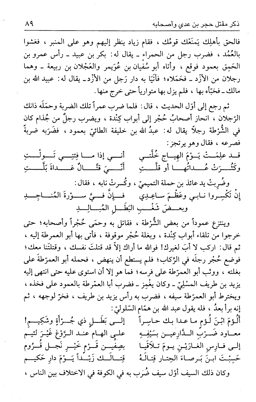 ثم رجع إلى أوّل الحديث، قال: فلما ضرب عمرًا تلك الضربة وحمَلَه ذانك الرّجلان، انحاز أصحابُ حُجْر إلى أبواب كِنْدة، ويضرب رجلٌ من جُذام كان في الشُّرْطة رجلًا يقال له: عبدُ الله بن خليفة الطائيّ بعمود، فضَرَبه ضربةً فصرعه، فقال وهو يرتجز: