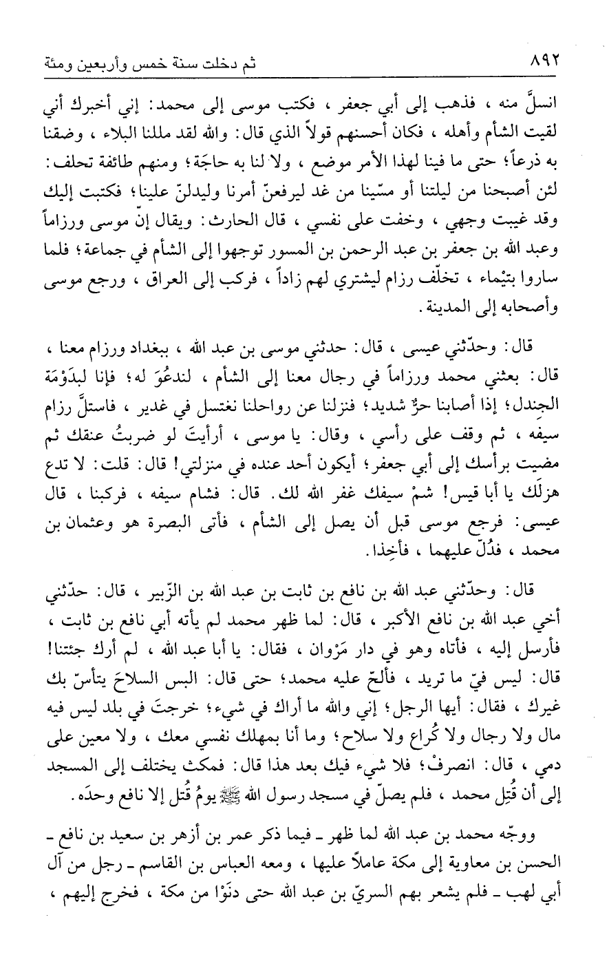 قال: وحدّثني عيسى، قال: حدثني موسى بن عبد الله، ببغداد ورزام معنا، قال: بعثني محمد ورزامًا في رجال معنا إلى الشأم، لندعُوَ له؛ فإنا لبدَوْمَة الجِندل؛ إذا أصابنا حرٌّ شديد؛ فنزلنا عن رواحلنا نغتسل في غدير، فاستلَّ رزام سيفه، ثم وقف على رأسي، وقال: يا موسى، أرأيتَ لو ضربتُ عنقك ثم مضيت برأسك إلى أبي جعفر؛ أيكون أحد عنده في منزلتي! قال: قلت: لا تدع هزلَك يا أبا قيس! شمْ سيفك غفر الله لك. قال: فشام سيفه، فركبنا، قال عيسى: فرجع موسى قبل أن يصل إلى الشأم، فأتى البصرة هو وعثمان بن محمد، فدُلّ عليهما، فأخِذا.