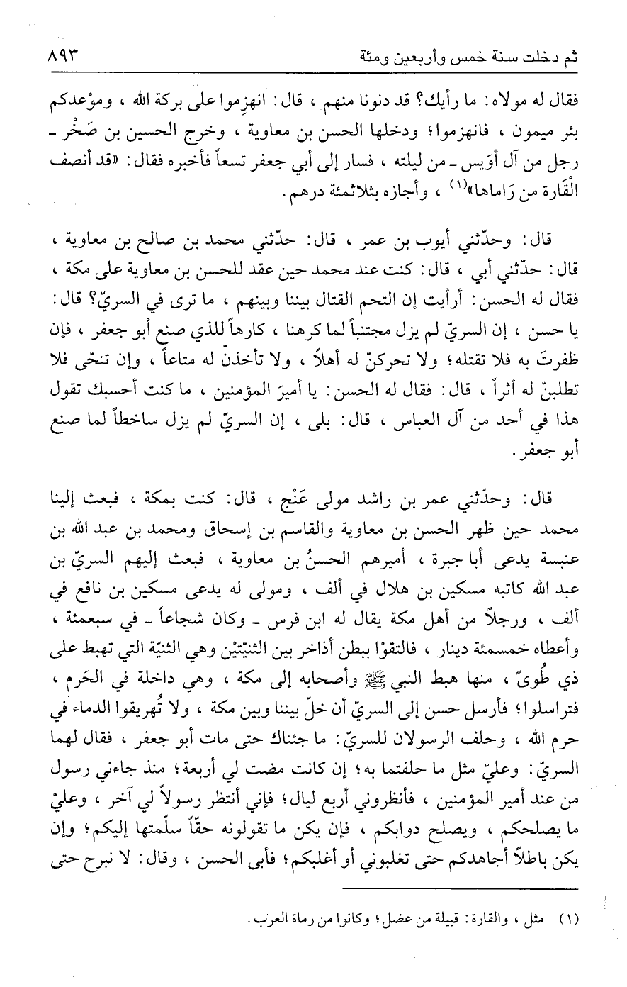 قال: وحدّثني عمر بن راشد مولى عَنْج، قال: كنت بمكة، فبعث إلينا محمد حين ظهر الحسن بن معاوية والقاسم بن إسحاق ومحمد بن عبد الله بن عنبسة يدعى أبا جبرة، أميرهم الحسنُ بن معاوية، فبعث إليهم السريّ بن عبد الله كاتبه مسكين بن هلال في ألف، ومولى له يدعى مسكين بن نافع في ألف، ورجلًا من أهل مكة يقال له ابن فرس - وكان شجاعًا - في سبعمئة، وأعطاه خمسمئة دينار، فالتقوْا ببطن أذاخر بين الثنيّتيْن وهي الثنيّة التي تهبط على ذي طُوىً، منها هبط النبي - صلى الله عليه وسلم - وأصحابه إلى مكة، وهي داخلة في الحَرم، فتراسلوا؛ فأرسل حسن إلى السريّ أن خلّ بيننا وبين مكة، ولا تُهريقوا الدماء في حرم الله، وحلف الرسولان للسريّ: ما جئناك حتى مات أبو جعفر، فقال لهما السريّ: وعليّ مثل ما حلفتما به؛ إن كانت مضت لي أربعة؛ منذ جاءني رسول من عند أمير المؤمنين، فأنظروني أربع ليال؛ فإني أنتظر رسولًا لي آخر، وعليّ ما يصلحكم، ويصلح دوابكم، فإن يكن ما تقولونه حقًّا سلّمتها إليكم؛ وإن يكن باطلًا أجاهدكم حتى تغلبوني أو أغلبكم؛ فأبى الحسن، وقال: لا نبرح حتى