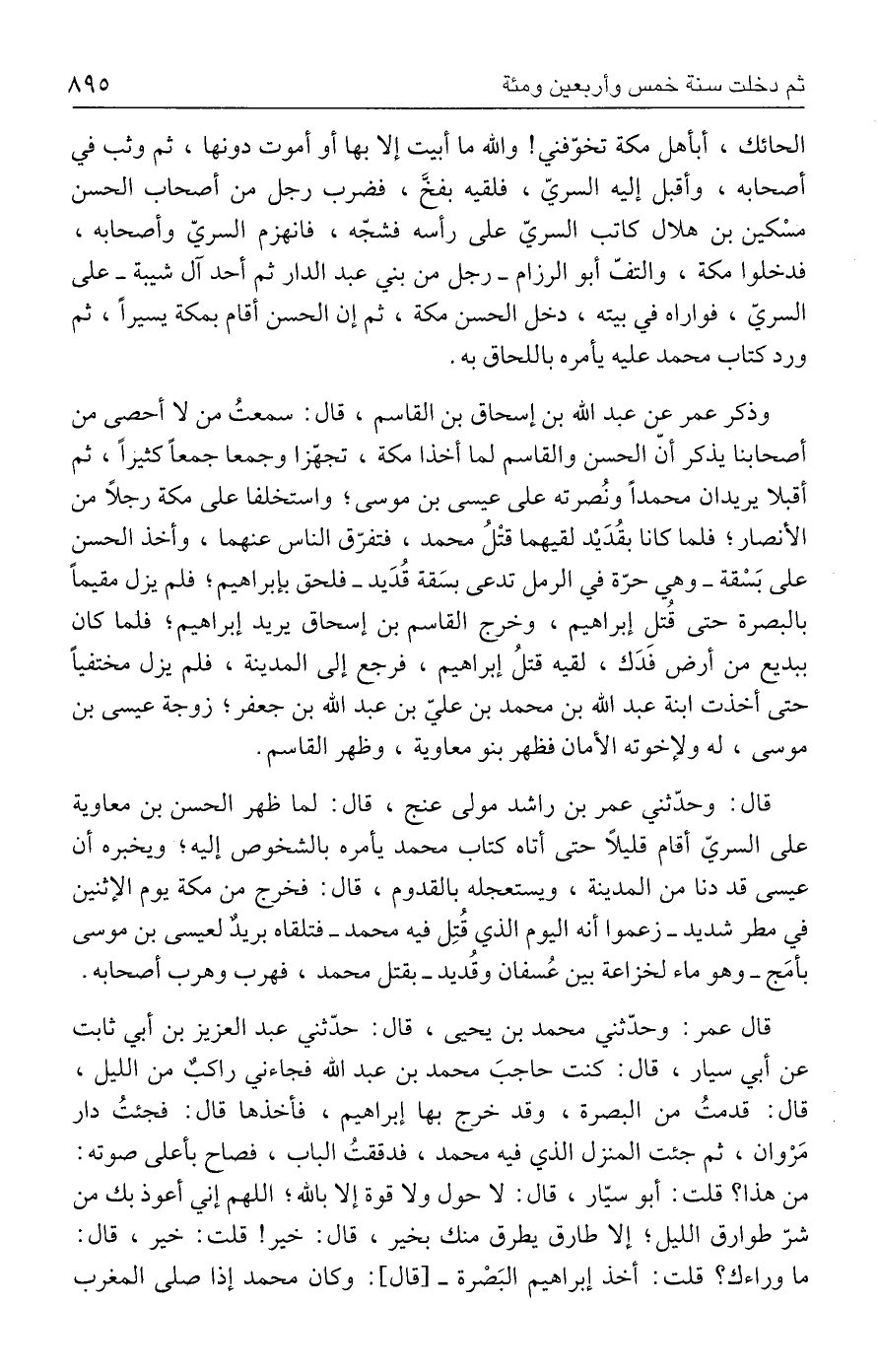 الحائك، أبأهل مكة تخوّفني! والله ما أبيت إلا بها أو أموت دونها، ثم وثب في أصحابه، وأقبل إليه السريّ، فلقيه بفخَّ، فضرب رجل من أصحاب الحسن مسْكين بن هلال كاتب السريّ على رأسه فشجّه، فانهزم السريّ وأصحابه، فدخلوا مكة، والتفّ أبو الرزام - رجل من بني عبد الدار ثم أحد آل شيبة - على السريّ، فواراه في بيته، دخل الحسن مكة، ثم إن الحسن أقام بمكة يسيرًا، ثم ورد كتاب محمد عليه يأمره باللحاق به.