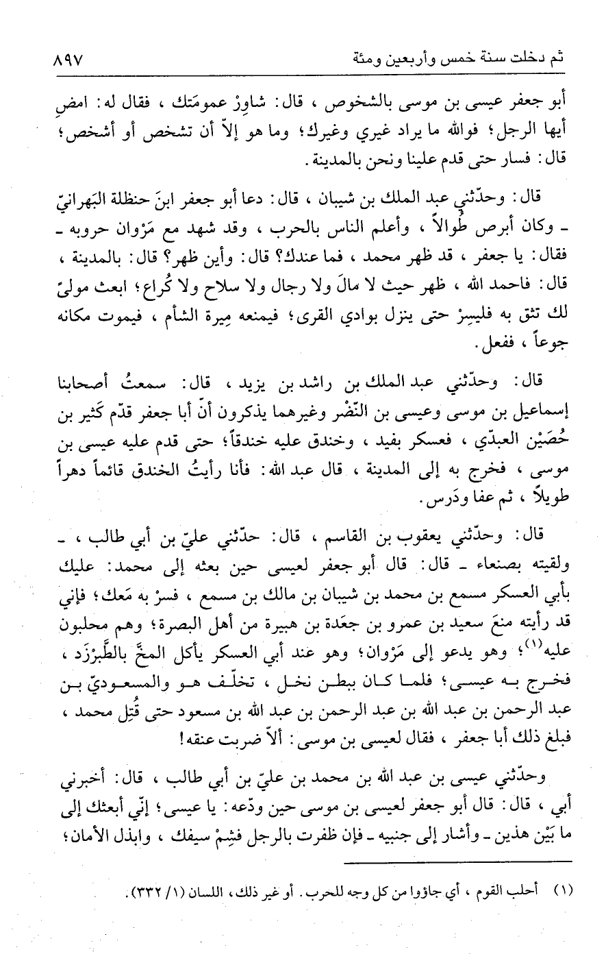 قال: وحدّثني يعقوب بن القاسم، قال: حدّثني عليّ بن أبي طالب، - ولقيته بصنعاء - قال: قال أبو جعفر لعيسى حين بعثه إلى محمد: عليك بأبي العسكر مسمع بن محمد بن شيبان بن مالك بن مسمع، فسرْ به مَعك؛ فإني قد رأيته منعَ سعيد بن عمرو بن جعَدة بن هبيرة من أهل البصرة؛ وهم محلبون عليه (١)؛ وهو يدعو إلى مَرْوان؛ وهو عند أبي العسكر يأكل المخَّ بالطَّبرْزَد، فخرج به عيسى؛ فلما كان ببطن نخل، تخلّف هو والمسعوديّ بن عبد الرحمن بن عبد الله بن عبد الرحمن بن عبد الله بن مسعود حتى قُتِل محمد، فبلغ ذلك أبا جعفر، فقال لعيسى بن موسى: ألّا ضربت عنقه!