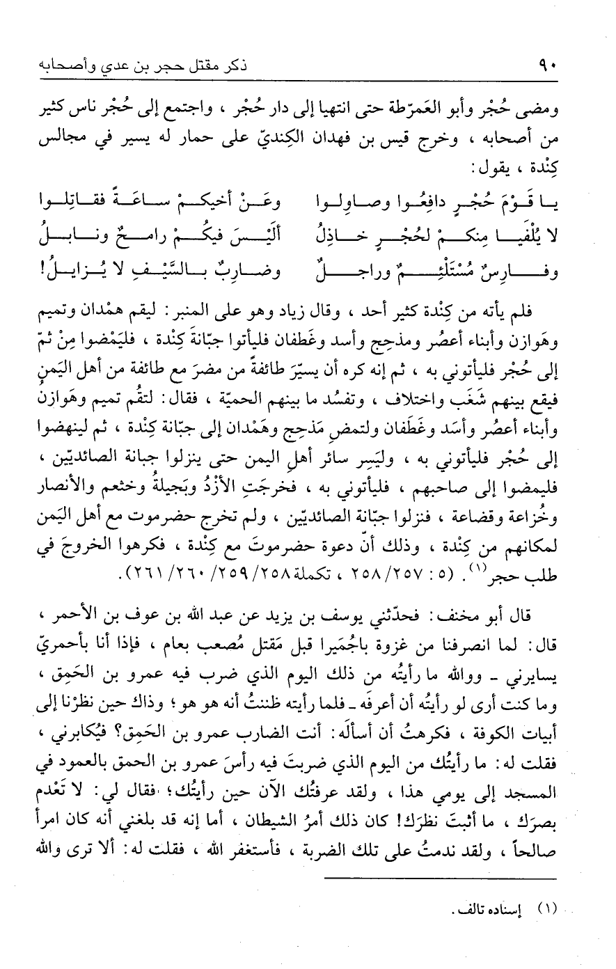 فلم يأته من كِنْدة كثير أحد، وقال زياد وهو على المنبر: ليقم همْدان وتميم وهَوازن وأبناء أعصُر ومذحِج وأسد وغَطفان فليأتوا جبّانةَ كِنْدة، فليَمْضوا مِنْ ثمّ إلى حُجْر فليأتوني به، ثم إنه كره أن يسيّرَ طائفةً من مضرَ مع طائفة من أهل اليَمن فيقع بينهم شَغَب واختلاف، وتفسُد ما بينهم الحميّة، فقال: لتقُم تميم وهَوازنُ وأبناء أعصُر وأسَد وغَطَفان ولتمضِ مَذحِج وهَمْدان إلى جبّانة كِنْدة، ثم لينهضوا إلى حُجْر فليأتوني به، وليَسِر سائرِ أهلِ اليمن حتى ينزلوا جبانة الصائديّين، فليمضوا إلى صاحبهم، فليأتوني به، فخرجَتِ الأزْدُ وبَجيلةُ وخثعم والأنصار وخُزاعة وقضاعة، فنزلوا جبّانة الصائديّين، ولم تخرج حضر موت مع أهل اليَمن لمكانهم من كِنْدة، وذلك أنّ دعوة حضر موتَ مع كِنْدة، فكرهوا الخروجَ في طلب حجر (١). (٥: ٢٥٨/ ٢٥٧، تكملة ٢٥٨/ ٢٦٠/٢٥٩/ ٢٦١).