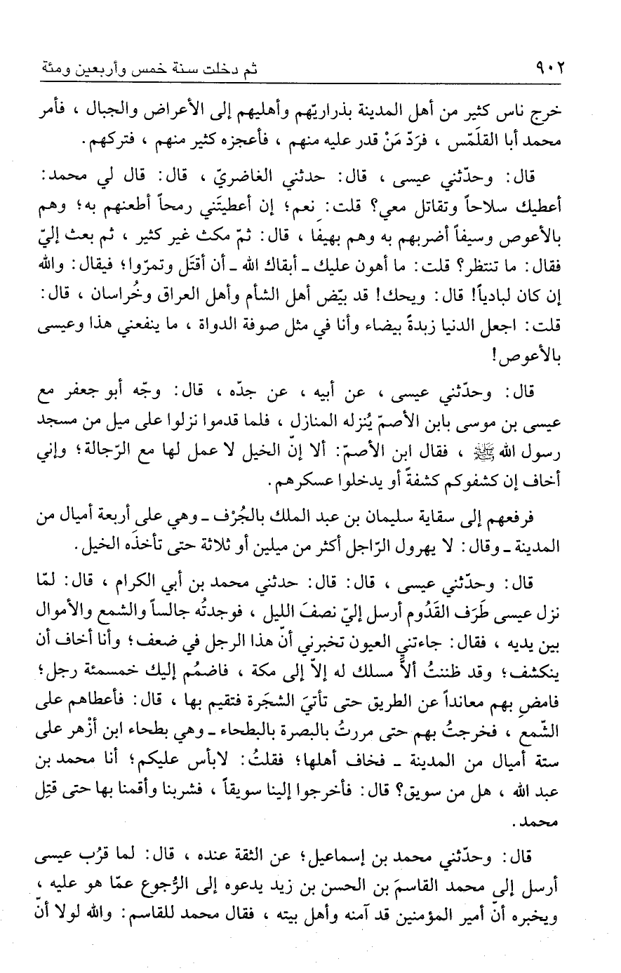 قال: وحدّثني محمد بن إسماعيل؛ عن الثقة عنده، قال: لما قرُب عيسى أرسل إلى محمد القاسمَ بن الحسن بن زيد يدعوه إلى الرُّجوع عمّا هو عليه، ويخبره أن أمير المؤمنين قد آمنه وأهل بيته، فقال محمد للقاسم: والله لولا أنّ