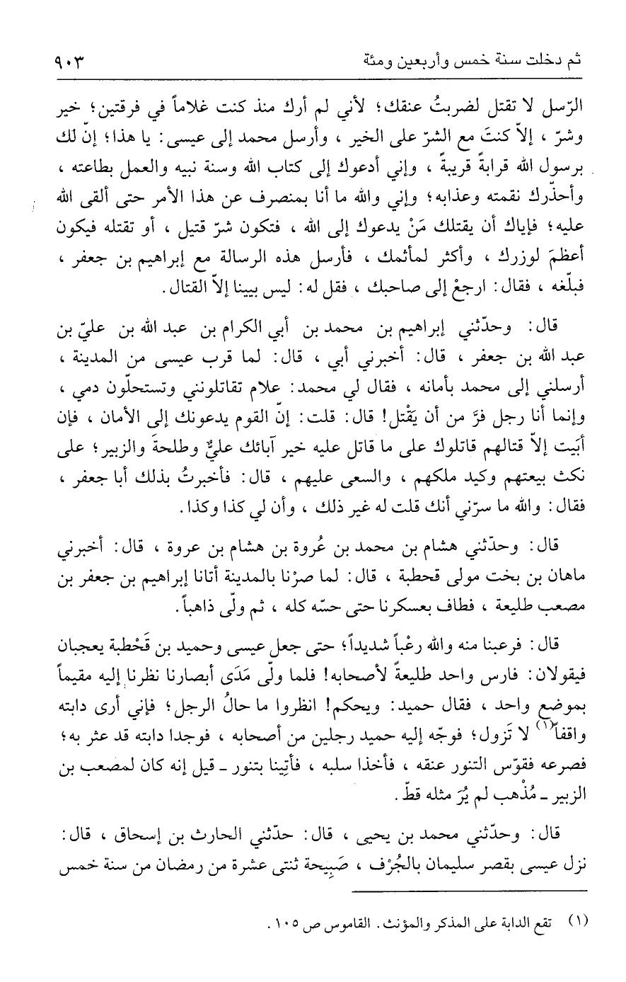 الرّسل لا تقتل لضربتُ عنقك؛ لأني لم أرك منذ كنت غلامًا في فرقتين؛ خير وشرّ، إلّا كنتَ مع الشرّ على الخير، وأرسل محمد إلى عيسى: يا هذا؛ إنّ لك برسول الله قرابةً قريبةً، وإني أدعوك إلى كتاب الله وسنة نبيه والعمل بطاعته، وأحذرك نقمته وعذابه؛ وإني والله ما أنا بمنصرف عن هذا الأمر حتى ألقى الله عليه؛ فإياك أن يقتلك مَنْ يدعوك إلى الله، فتكون شرّ قتيل، أو تقتله فيكون أعظمَ لوزرك، وأكثر لمأثمك، فأرسل هذه الرسالة مع إبراهيم بن جعفر، فبلّغه، فقال: ارجعْ إلى صاحبك، فقل له: ليس بيينا إلّا القتال.