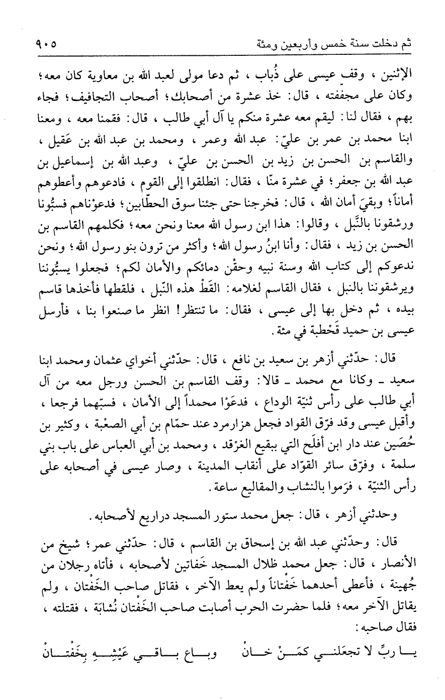 قال: حدّثني أزهر بن سعيد بن نافع، قال: حدّثني أخواي عثمان ومحمد ابنا سعيد - وكانا مع محمد - قالا: وقف القاسم بن الحسن ورجل معه من آل أبي طالب على رأس ثنيّة الوداع، فدعَوْا محمدًا إلى الأمان، فسبّهما فرجعا، وأقبل عيسى وقد فرّق القواد فجعل هزارمرد عند حمّام بن أبي الصعْبة، وكثير بن حُصَين عند دار ابن أفلَح التي ببقيع الغرْقد، ومحمد بن أبي العباس على باب بني سلمة، وفرّق سائر القوّاد على أنقاب المدينة، وصار عيسى في أصحابه على رأس الثنيّة، فرَموا بالنشاب والمقاليع ساعة.