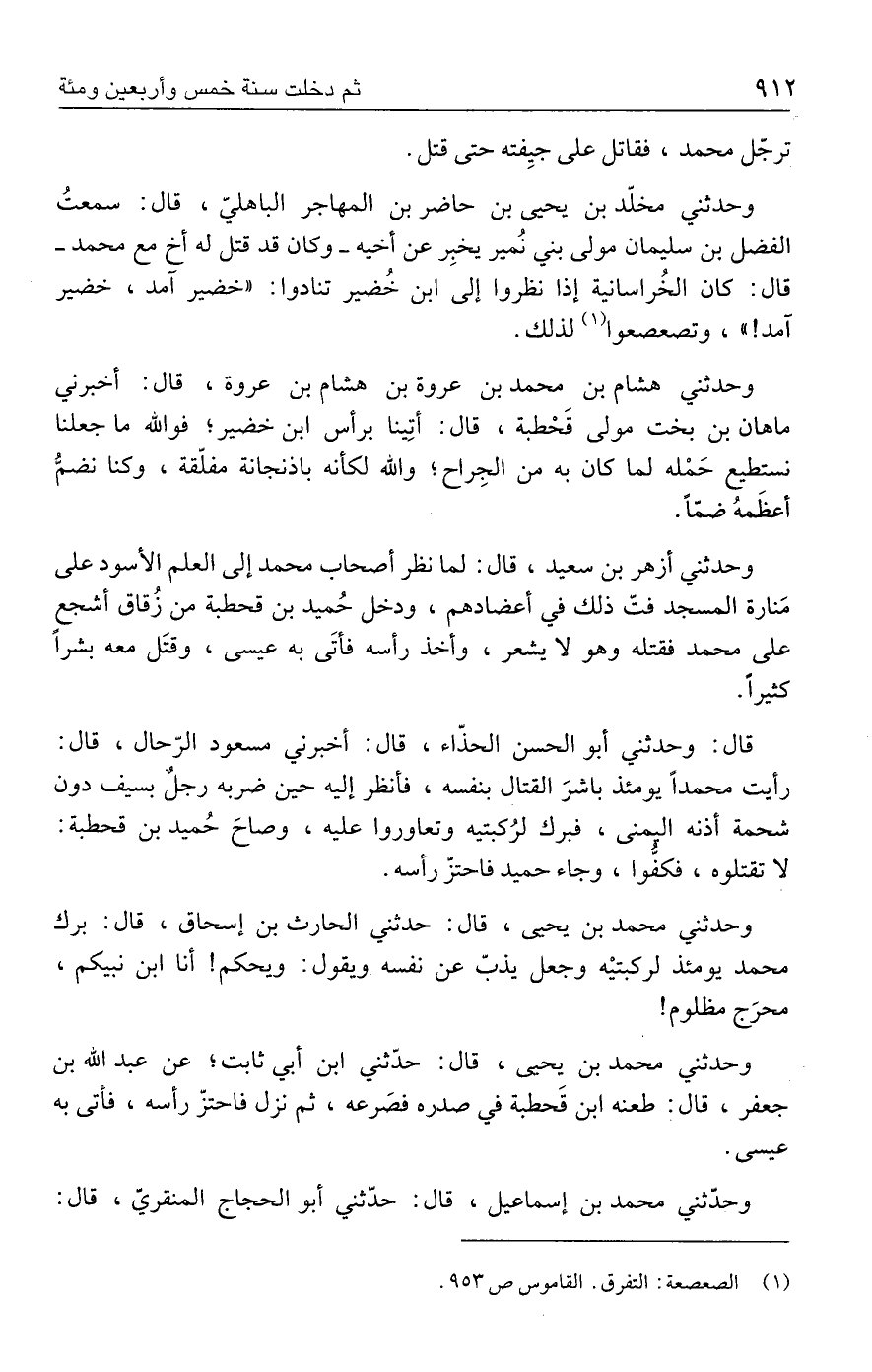 وحدثني مخلّد بن يحيى بن حاضر بن المهاجر الباهليّ، قال: سمعتُ الفضل بن سليمان مولى بني نُمير يخبِر عن أخيه - وكان قد قتل له أخ مع محمد - قال: كان الخُراسانية إذا نظروا إلى ابن خُضير تنادوا: "خضير آمد، خضير آمد! "، وتصعصعوا (١) لذلك.