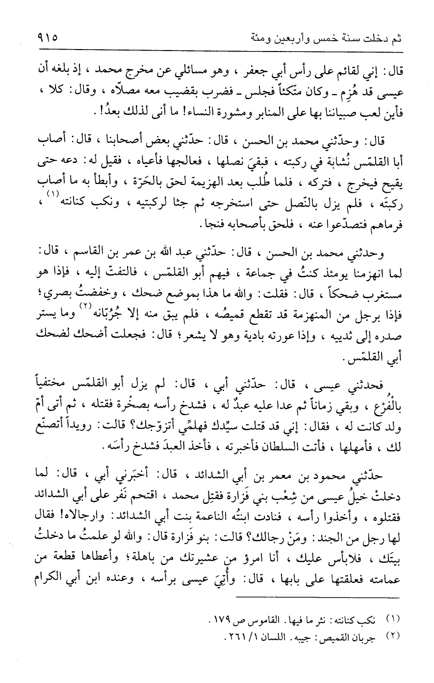 وحدثني محمد بن الحسن، قال: حدّثني عبد الله بن عمر بن القاسم، قال: لما انهزمنا يومئذ كنتُ في جماعة، فيهم أبو القلمّس، فالتفتّ إليه، فإذا هو مستغرب ضحكًا، قال: فقلت: والله ما هذا بموضع ضحك، وخفضتُ بصري؛ فإذا برجل من المنهزمة قد تقطع قميصُه، فلم يبق منه إلا جُرُبّانه (٢) وما يستر صدره إلى ثدييه، وإذا عورته بادية وهو لا يشعر؛ قال: فجعلت أضحك لضحك أبي القلمّس.