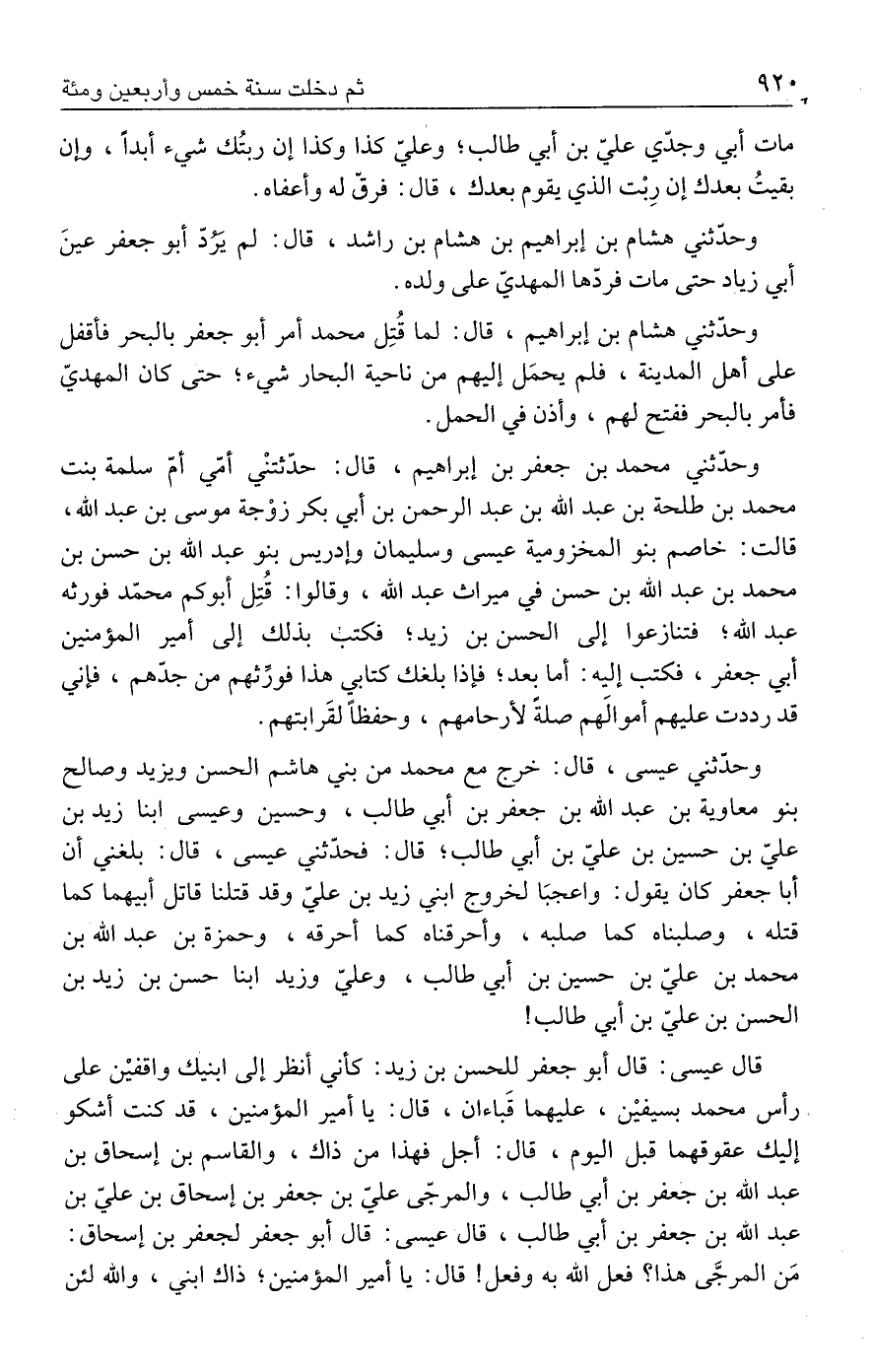 وحدّثني عيسى، قال: خرج مع محمد من بني هاشم الحسن ويزيد وصالح بنو معاوية بن عبد الله بن جعفر بن أبي طالب، وحسين وعيسى ابنا زيد بن عليّ بن حسين بن عليّ بن أبي طالب؛ قال: فحدّثني عيسى، قال: بلغني أن أبا جعفر كان يقول: واعجبَا لخروج ابني زيد بن عليّ وقد قتلنا قاتل أبيهما كما قتله، وصلبناه كما صلبه، وأحرقناه كما أحرقه، وحمزة بن عبد الله بن محمد بن عليّ بن حسين بن أبي طالب، وعليّ وزيد ابنا حسن بن زيد بن الحسن بن عليّ بن أبي طالب!
