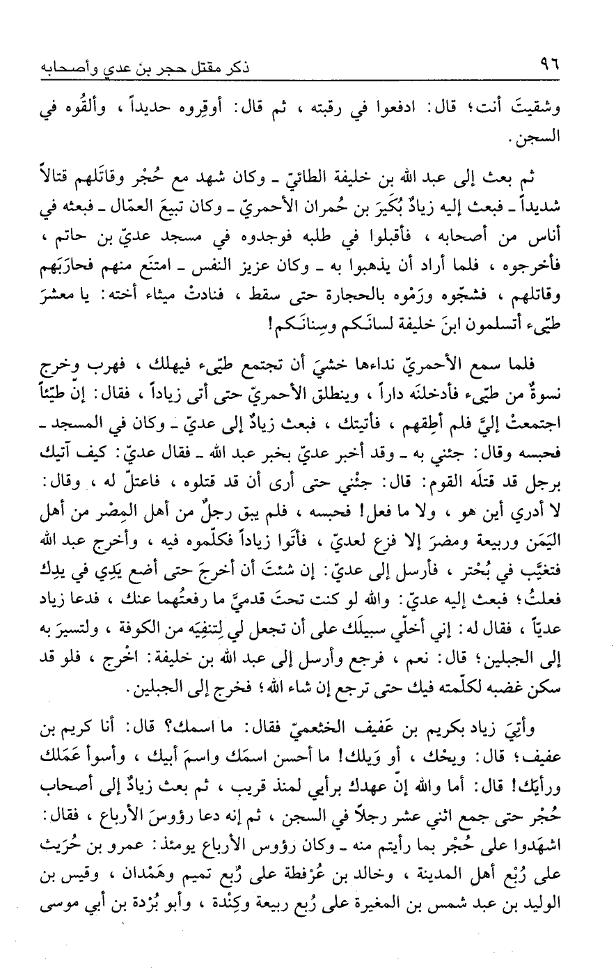 ثم بعث إلى عبد الله بن خليفة الطائيّ -وكان شهد مع حُجْر وقاتَلهم قتالًا شديدًا- فبعث إليه زيادٌ بُكَيرَ بن حُمران الأحمريّ -وكان تبيعَ العمّال- فبعثه في أناس من أصحابه، فأقبلوا في طلبه فوجدوه في مسجد عديّ بن حاتم، فأخرجوه، فلما أراد أن يذهبوا به -وكان عزيز النفس- امتنَع منهم فحارَبَهم وقاتلهم، فشجّوه ورَمْوه بالحجارة حتى سقط، فنادتْ ميثاء أخته: يا معشرَ طيّئ أتسلمون ابنَ خليفة لسانَكم وسِنانَكم!