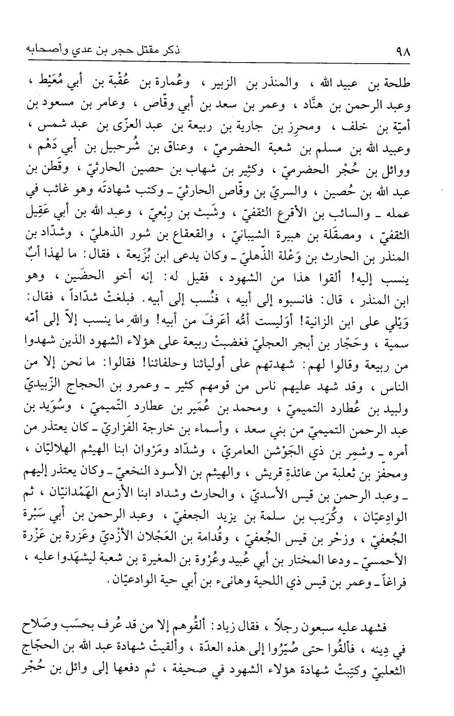 فشهد عليه سبعون رجلًا، فقال زياد: ألقُوهم إلا من قد عُرف بحسَب وصَلاح في دِينه، فألقُوا حتى صُيّرُوا إلى هذه العدّة، وألقيتْ شهادة عبد الله بن الحجّاج الثعلبيّ وكتِبتْ شهادة هؤلاء الشهود في صحيفة، ثم دفعها إلى وائل بن حُجْر