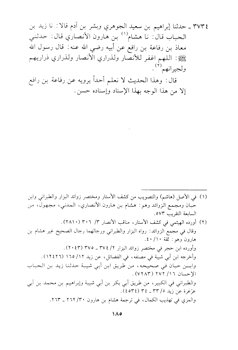 3734 - حَدَّثَنَا إِبْرَاهِيمُ بْنُ سَعِيدٍ الْجَوْهَرِيُّ، وَبِشْرُ بْنُ آدَمَ، قَالَا: نَا زَيْدُ بْنُ الْحُبَابِ، قَالَ: نَا هِشَامُ بْنُ هَارُونَ الْأَنْصَارِيُّ، قَالَ: حَدَّثَنِي مُعَاذُ بْنُ رِفَاعَةَ بْنِ رَافِعٍ، عَنْ أَبِيهِ رَضِيَ اللَّهُ عَنْهُ، قَالَ رَسُولُ اللَّهِ صلَّى اللَّهُ عَلَيْهِ وَسَلَّمَ: «§اللَّهُمَّ اغْفِرْ لِلْأَنْصَارِ وَلِذَرَارِيِّ الْأَنْصَارِ وَلِذَرَارِيِّ ذَرَارِيِّهِمْ ولَجَيِرانهِمْ» قَالَ: وَهَذَا الْحَدِيثُ لَا نَعْلَمُ أَحَدًا يَرْوِيهِ عَنْ رِفَاعَةَ بْنِ رَافِعٍ إِلَّا مِنْ هَذَا الْوَجْهِ بِهَذَا الْإِسْنَادِ، وَإِسْنَادُهُ حَسَنٌ