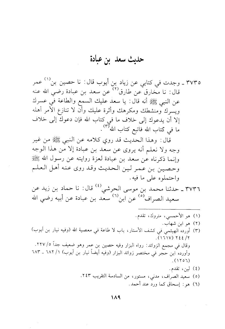 3735 - وَجَدْتُ فِي كِتَابِي، عَنْ زِيَادِ بْنِ أَيُّوبَ، قَالَ: نَا حُصَيْنُ بْنُ عُمَرَ، قَالَ: نَا مُخَارِقٌ، عَنْ طَارِقٍ، عَنْ سَعْدِ بْنِ عُبَادَةَ، رَضِيَ اللَّهُ عَنْهُ، عَنِ النَّبِيِّ صَلَّى اللهُ عَلَيْهِ وَسَلَّمَ أَنَّهُ قَالَ: «يَا سَعْدُ، §عَلَيْكَ السَّمْعَ وَالطَّاعَةَ فِي عُسْرِكَ وَيُسْرِكَ وَمَنْشَطِكَ وَمَكْرَهِكَ وَأَثَرَةً عَلَيْكَ وَأَنْ لَا تُنَازِعَ الْأَمْرَ أَهْلَهُ إِلَّا أَنْ يَدْعُوكَ إِلَى خِلَافِ مَا فِي كِتَابِ اللَّهِ فَإِنْ دَعَوْكَ إِلَى خِلَافِ مَا فِي كِتَابِ اللَّهِ فَاتَّبِعْ كِتَابَ اللَّهِ» قَالَ: وَهَذَا الْحَدِيثُ قَدْ رُوِيَ كَلَامَهُ، عَنِ النَّبِيِّ صَلَّى اللهُ عَلَيْهِ وَسَلَّمَ مِنْ غَيْرِ وَجْهٍ، وَلَا نَعْلَمُ أَنَّهُ يُرْوَى عَنْ سَعْدِ بْنِ عُبَادَةَ إِلَّا مِنْ هَذَا الْوَجْهِ، وَإِنَّمَا ذَكَرْنَاهُ، عَنْ سَعْدِ بْنِ عُبَادَةَ لِعِزَّةِ رِوَايَتِهِ عَنْ رَسُولِ اللَّهِ صَلَّى اللهُ عَلَيْهِ وَسَلَّمَ، وَحُصَيْنُ بْنُ عُمَرَ لَيِّنُ الْحَدِيثِ وَقَدْ رَوَى عَنْهُ أَهْلُ الْعِلْمِ وَاحْتَمَلُوهُ عَلَى مَا فِيهِ