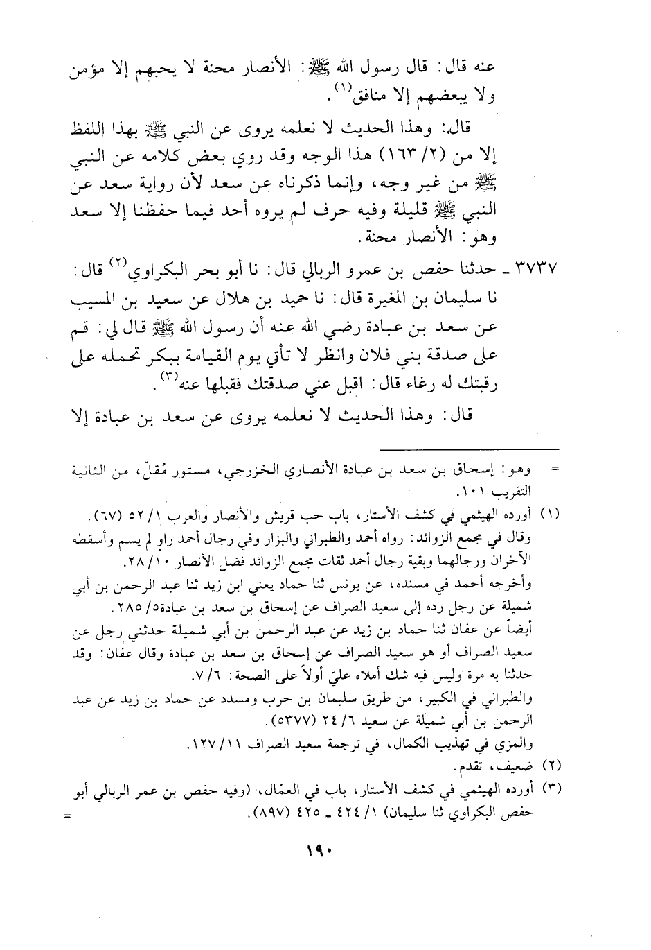 3737 - حَدَّثَنَا حَفْصُ بْنُ عَمْرٍو الرَّبَالِيُّ، قَالَ: نَا أَبُو بَحْرٍ الْبَكْرَاوِيُّ، قَالَ: نَا سُلَيْمَانُ بْنُ الْمُغِيرَةِ، قَالَ: نَا حُمَيْدُ بْنُ هِلَالٍ، عَنْ سَعِيدِ بْنِ الْمُسَيَّبِ، عَنْ سَعْدِ بْنِ عُبَادَةَ، رَضِيَ اللَّهُ عَنْهُ أَنَّ رَسُولَ اللَّهِ صَلَّى اللهُ عَلَيْهِ وَسَلَّمَ قَالَ لِي: «قُمْ عَلَى صَدَقَةِ بَنِي فُلَانٍ، وَانْظُرْ §لَا تَأْتِي يَوْمَ الْقِيَامَةِ بِبَكْرٍ تَحْمِلُهُ عَلَى رَقَبَتِكَ لَهُ رُغَاءٌ» قَالَ: اقْبَلْ عَنِّي صَدَقَتَكَ فَقَبِلَهَا عَنْهُ. قَالَ: وَهَذَا الْحَدِيثُ لَا نَعْلَمُهُ يُرْوَى عَنْ سَعْدِ بْنِ عُبَادَةَ إِلَّا -[191]- مِنْ هَذَا الْوَجْهِ بِهَذَا اللَّفْظِ وَإِسْنَادُهُ حَسَنٌ