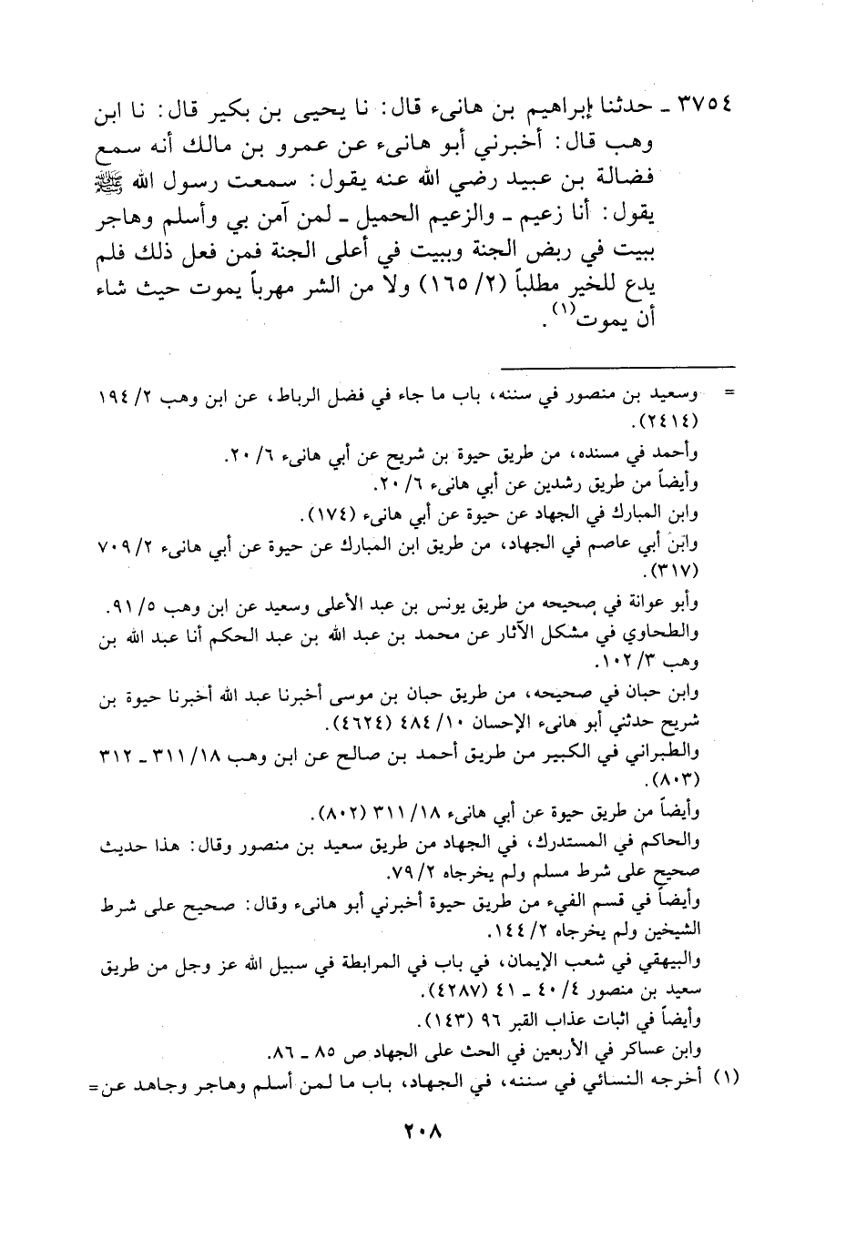 3754 - حَدَّثَنَا إِبْرَاهِيمُ بْنُ هَانِئٍ، قَالَ: نَا يَحْيَى بْنُ بُكَيْرٍ، قَالَ: نَا ابْنُ وَهْبٍ، قَالَ: أَخْبَرَنِي أَبُو هَانِئٍ، عَنْ عَمْرِو بْنِ مَالِكٍ، أَنَّهُ سَمِعَ فَضَالَةَ بْنَ عُبَيْدٍ، رَضِيَ اللَّهُ عَنْهُ يَقُولُ سَمِعْتُ رَسُولَ اللَّهِ صَلَّى اللهُ عَلَيْهِ وَسَلَّمَ يَقُولُ: «§أَنَا زَعِيمٌ وَالزَّعِيمُ الْحَمِيلُ لِمَنْ آمَنَ بِي وَأَسْلَمَ وَهَاجَرَ بِبَيْتٍ فِي رَبَضِ الْجَنَّةِ وَبِبَيْتٍ فِي أَعْلَى الْجَنَّةِ، فَمَنْ فَعَلَ ذَلِكَ فَلَمْ يَدَعْ لِلْخَيْرِ مَطْلَبًا، وَلَا مِنَ الشَّرِّ مَهْرَبًا يَمُوتُ حَيْثُ شَاءَ أَنْ يَمُوتَ»