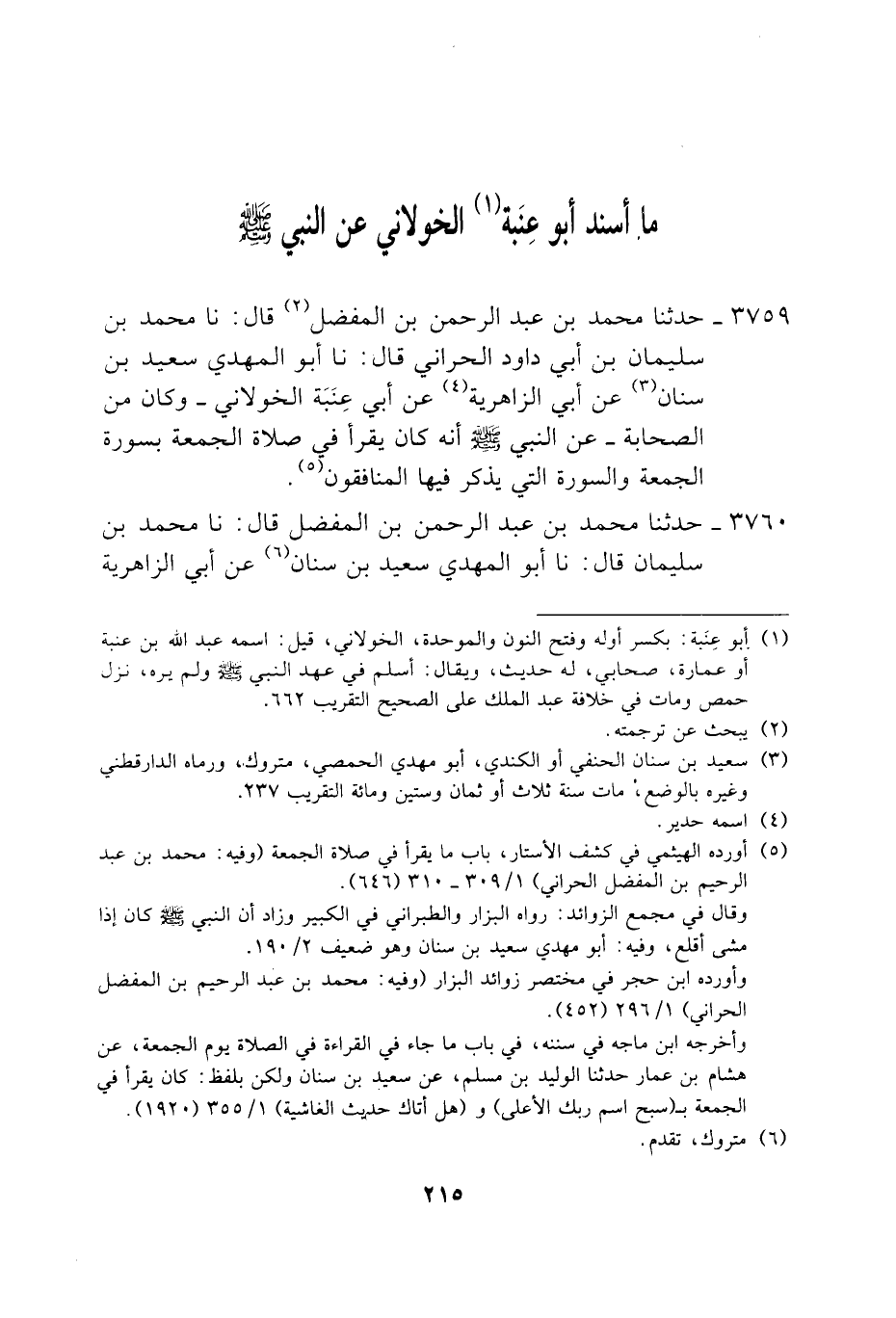 3759 - حَدَّثَنَا مُحَمَّدُ بْنُ عَبْدِ الرَّحْمَنِ بْنِ الْمُفَضَّلِ، قَالَ: نَا مُحَمَّدُ بْنُ سُلَيْمَانَ بْنِ أَبِي دَاوُدَ الْحَرَّانِيُّ، قَالَ: نَا أَبُو الْمَهْدِيِّ سَعِيدُ بْنُ سِنَانٍ، عَنْ أَبِي الزَّاهِرِيَّةِ، عَنْ أَبِي عِنَبَةَ الْخَوْلَانِيِّ وَكَانَ مِنَ الصَّحَابَةِ، عَنِ النَّبِيِّ صَلَّى اللهُ عَلَيْهِ وَسَلَّمَ «أَنَّهُ §كَانَ يَقْرَأُ فِي صَلَاةِ الْجُمُعَةِ بِسُورَةِ الْجُمُعَةِ، وَالسُّورَةِ الَّتِي يُذْكَرُ فِيهَا الْمُنَافِقُونَ»