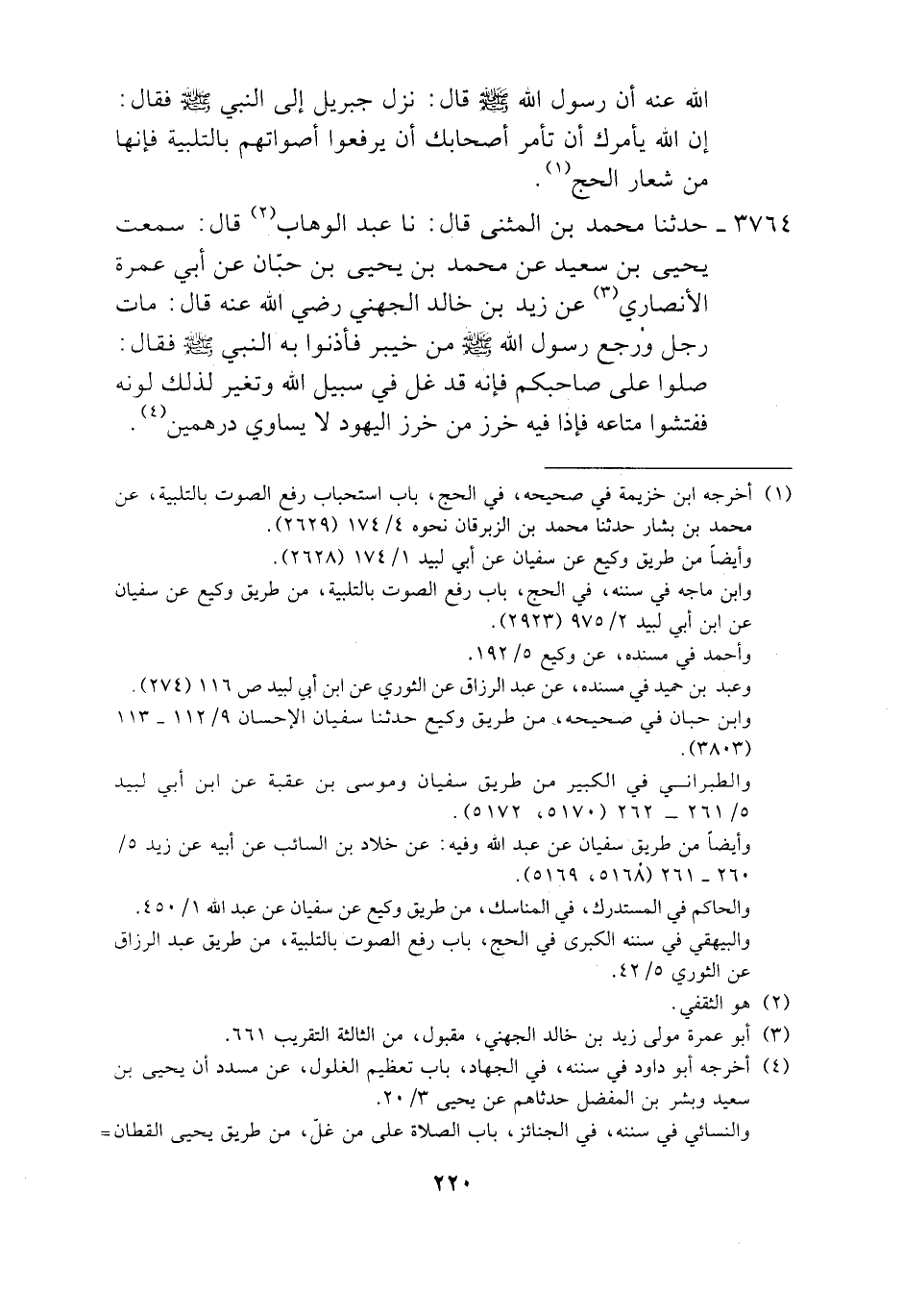 3764 - حَدَّثَنَا مُحَمَّدُ بْنُ الْمُثَنَّى، قَالَ: نَا عَبْدُ الْوَهَّابِ، قَالَ: سَمِعْتُ يَحْيَىَ بْنَ سَعِيدٍ، عَنْ مُحَمَّدِ بْنِ يَحْيَى بْنِ حَبَّانَ، عَنْ أَبِي عَمْرَةَ الْأَنْصَارِيِّ، عَنْ زَيْدِ بْنِ خَالِدٍ الْجُهَنِيِّ رَضِيَ اللَّهُ عَنْهُ، قَالَ: مَاتَ رَجُلٌ وَرَجَعَ رَسُولُ اللَّهِ صَلَّى اللهُ عَلَيْهِ وَسَلَّمَ مِنْ خَيْبَرَ فَأْذِنُوا بِهِ النَّبِيَّ صَلَّى اللهُ عَلَيْهِ وَسَلَّمَ فَقَالَ: «§صَلُّوا عَلَى صَاحِبِكُمْ فَإِنَّهُ قَدْ غَلَّ فِي سَبِيلِ اللَّهِ» وَتَغَيَّرَ لِذَلِكَ لَوْنُهُ فَفَتَّشُوا مَتَاعَهُ فَإِذَا فِيهِ خَرَزٌ مِنْ خَرَزِ الْيَهُودِ لَا يُسَاوِي دِرْهَمَيْنِ