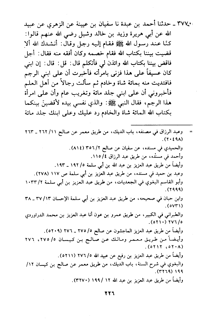 3770 - حَدَّثَنَا أَحْمَدُ بْنُ عَبْدَةَ، نَا سُفْيَانُ بْنُ عُيَيْنَةَ، عَنِ الزُّهْرِيِّ، عَنْ عُبَيْدِ اللَّهِ، عَنْ أَبِي هُرَيْرَةَ، وَزَيْدِ بْنِ خَالِدٍ، وَشِبْلٍ، رَضِيَ اللَّهُ عَنْهُمْ قَالُوا: كُنَّا عِنْدَ رَسُولِ اللَّهِ صَلَّى اللهُ عَلَيْهِ وَسَلَّمَ فَقَامَ إِلَيْهِ رَجُلُ، وَقَالَ: أَنْشُدُكَ اللَّهُ أَلَا قَضَيْتَ بَيْنَنَا بِكِتَابِ اللَّهِ فَقَامَ خَصْمُهُ، وَكَانَ أَفْقَهَ مِنْهُ فَقَالَ: أَجَلْ فَاقْضِ بَيْنَنَا بِكِتَابِ اللَّهِ وَائذَنْ لِي فَأَتَكَلَّمَ، قَالَ: قُلْ، قَالَ: إِنَّ ابْنِي كَانَ عَسِيفًا عَلَى هَذَا فَزَنَى بِامْرَأَتِهِ فَأُخْبِرْتُ أَنَّ عَلَى ابْنِي الرَّجْمَ، فَافْتَدَيْتُ مِنْهُ بِمِائَةِ شَاةٍ وَخَادِمٍ، ثُمَّ سَأَلْتُ رِجَالًا مِنْ أَهْلِ الْعِلْمِ فَأَخْبَرُونِي أَنَّ عَلَى ابْنِي جَلْدَ مِائَةٍ وَتَغْرِيبَ عَامٍ وَأَنَّ عَلَى امْرَأَةِ هَذَا الرَّجْمُ، فَقَالَ النَّبِيُّ صَلَّى اللهُ عَلَيْهِ وَسَلَّمَ: «وَالَّذِي نَفْسِي بِيَدِهِ لَأَقْضِيَنَّ بَيْنَكُمَا بِكِتَابِ اللَّهِ §الْمِائَةُ شَاةٍ وَالْخَادِمُ رَدٌّ عَلَيْكَ وَعَلَى ابْنِكَ جَلْدُ مِائَةٍ -[227]- وَتَغْرِيبُ عَامٍ، وَاغْدُ أَنْتَ يَا أُنَيْسُ عَلَى امْرَأَةِ هَذَا، فَإِنِ اعْتَرَفَتْ فَارْجُمْهَا» فَغَدَا عَلَيْهَا فَاعْتَرَفَتْ فَرَجَمَهَا