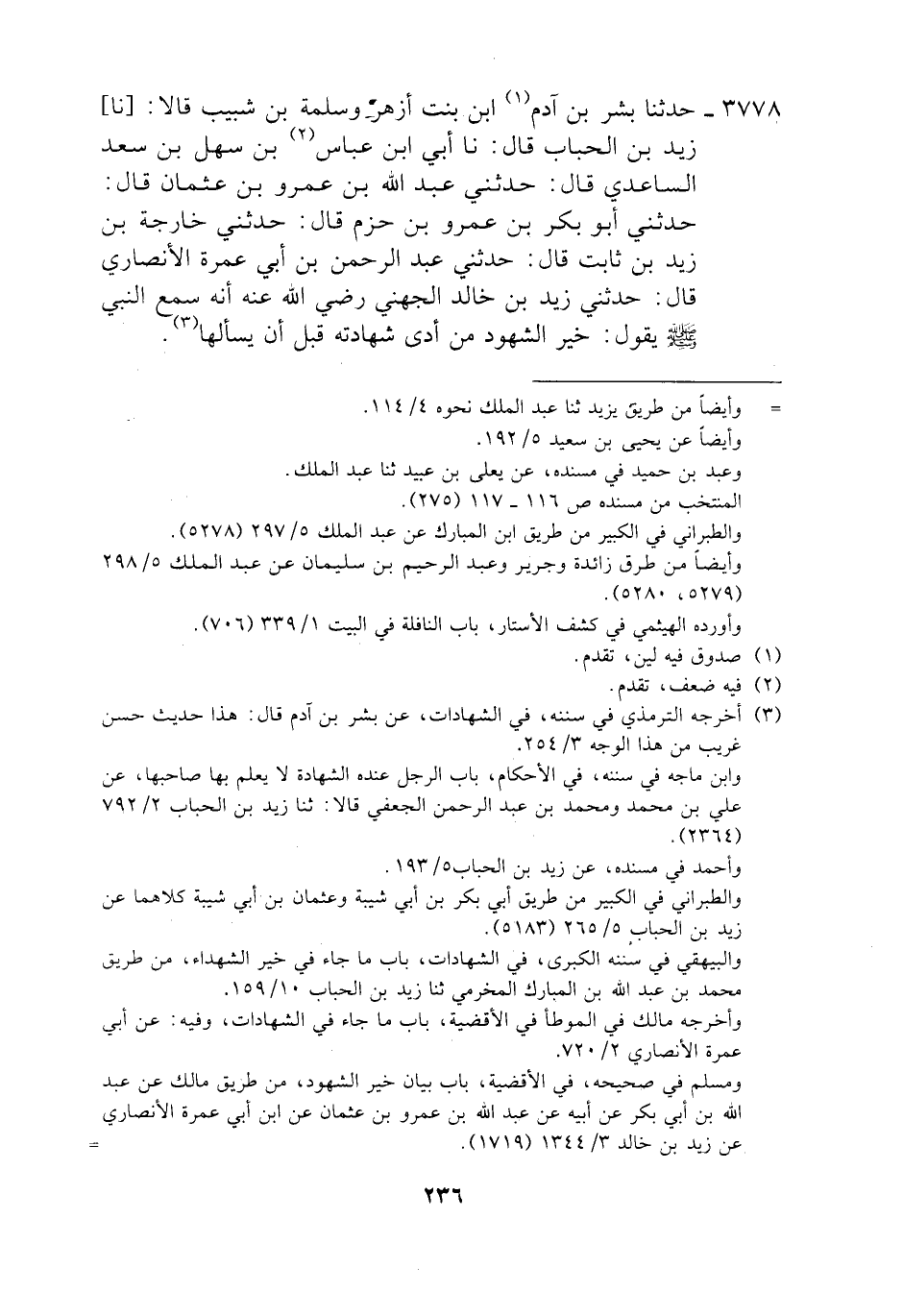 3778 - حَدَّثَنَا بِشْرُ بْنُ آدَمَ ابْنُ بِنْتِ أَزْهَرَ، وَسَلَمَةُ بْنُ شَبِيبٍ، قَالَا: نَا زَيْدُ بْنُ الْحُبَابِ، قَالَ: نَا أَبِي ابْنُ عَبَّاسِ بْنِ سَهْلِ بْنِ سَعْدٍ السَّاعِدِيُّ، قَالَ: حَدَّثَنِي عَبْدُ اللَّهِ بْنُ عَمْرِو بْنِ عُثْمَانَ، قَالَ: حَدَّثَنِي أَبُو بَكْرِ بْنُ عَمْرِو بْنِ حَزْمٍ، قَالَ: حَدَّثَنِي خَارِجَةُ بْنُ زَيْدِ بْنِ ثَابِتٍ، قَالَ: حَدَّثَنِي عَبْدُ الرَّحْمَنِ بْنُ أَبِي عَمْرَةَ الْأَنْصَارِيُّ، قَالَ: حَدَّثَنِي زَيْدُ بْنُ خَالِدٍ الْجُهَنِيُّ، رَضِيَ اللَّهُ، عَنْهُ أَنَّهُ سَمِعَ النَّبِيَّ صَلَّى اللهُ عَلَيْهِ وَسَلَّمَ يَقُولُ: «§خَيْرُ الشُّهُودِ مَنْ أَدَّى شَهَادَتَهُ قَبْلَ أَنْ يَسْأَلَهَا»