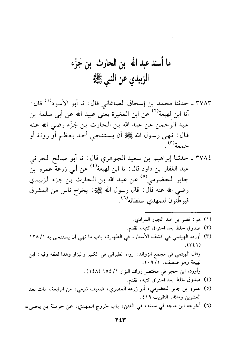 3783 - حَدَّثَنَا مُحَمَّدُ بْنُ إِسْحَاقَ الصَّاغَانِيُّ، قَالَ: نَا أَبُو الْأَسْوَدِ، قَالَ: أَنَا ابْنُ لَهِيعَةَ، عَنِ ابْنِ الْمُغِيرَةِ يَعْنِي عُبَيْدَ اللَّهِ، عَنْ أَبِي سَلَمَةَ بْنِ عَبْدِ الرَّحْمَنِ، عَنْ عَبْدِ اللَّهِ بْنِ الْحَارِثِ بْنِ جَزْءٍ، رَضِيَ اللَّهُ، عَنْهُ، قَالَ: «§نَهَى رَسُولُ اللَّهِ صَلَّى اللهُ عَلَيْهِ وَسَلَّمَ أَنْ يَسْتَنْجِيَ أَحَدٌ بِعَظْمٍ أَوْ رَوْثَةٍ أَوْ حُمَمَةٍ»