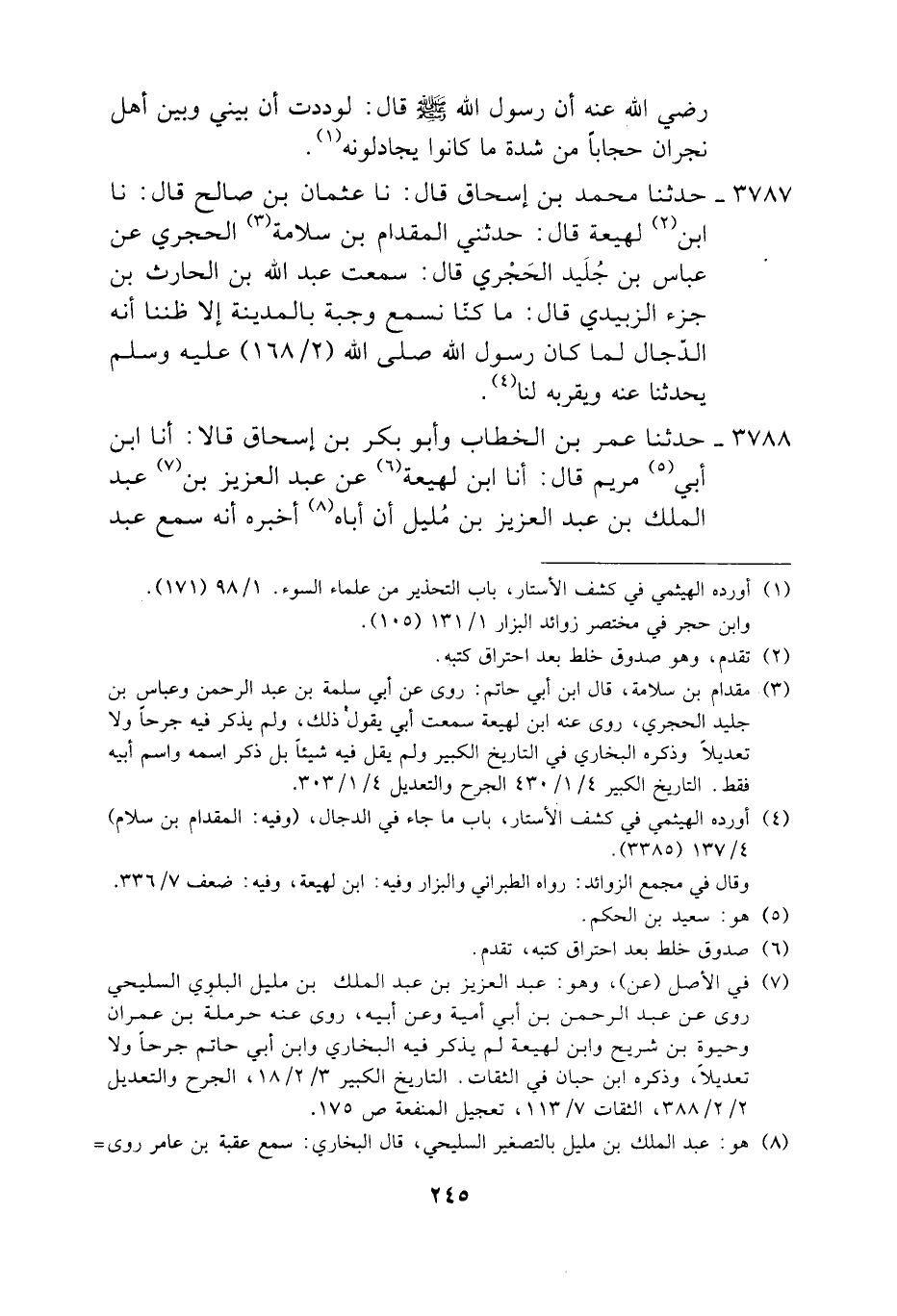 3787 - حَدَّثَنَا مُحَمَّدُ بْنُ إِسْحَاقَ، قَالَ: نَا عُثْمَانُ بْنُ صَالِحٍ، قَالَ: نَا ابْنُ لَهِيعَةَ، قَالَ: حَدَّثَنِي الْمِقْدَامُ بْنُ سَلَامَةَ الْحَجْرِيُّ، عَنْ عَبَّاسِ بْنِ جُلَيْدٍ الْحَجْرِيِّ، قَالَ: سَمِعْتُ عَبْدَ اللَّهِ بْنَ الْحَارِثِ بْنِ جَزْءٍ الزُّبَيْدِيَّ، قَالَ: «§مَا كُنَّا نَسْمَعُ وَجْبَةً بِالْمَدِينَةِ إِلَّا ظَنَنَّا أَنَّهُ الدَّجَّالُ لِمَا كَانَ رَسُولُ اللَّهِ صَلَّى اللهُ عَلَيْهِ وَسَلَّمَ يُحَدِّثُنَا عَنْهُ وَيُقَرِّبُهُ لَنَا»