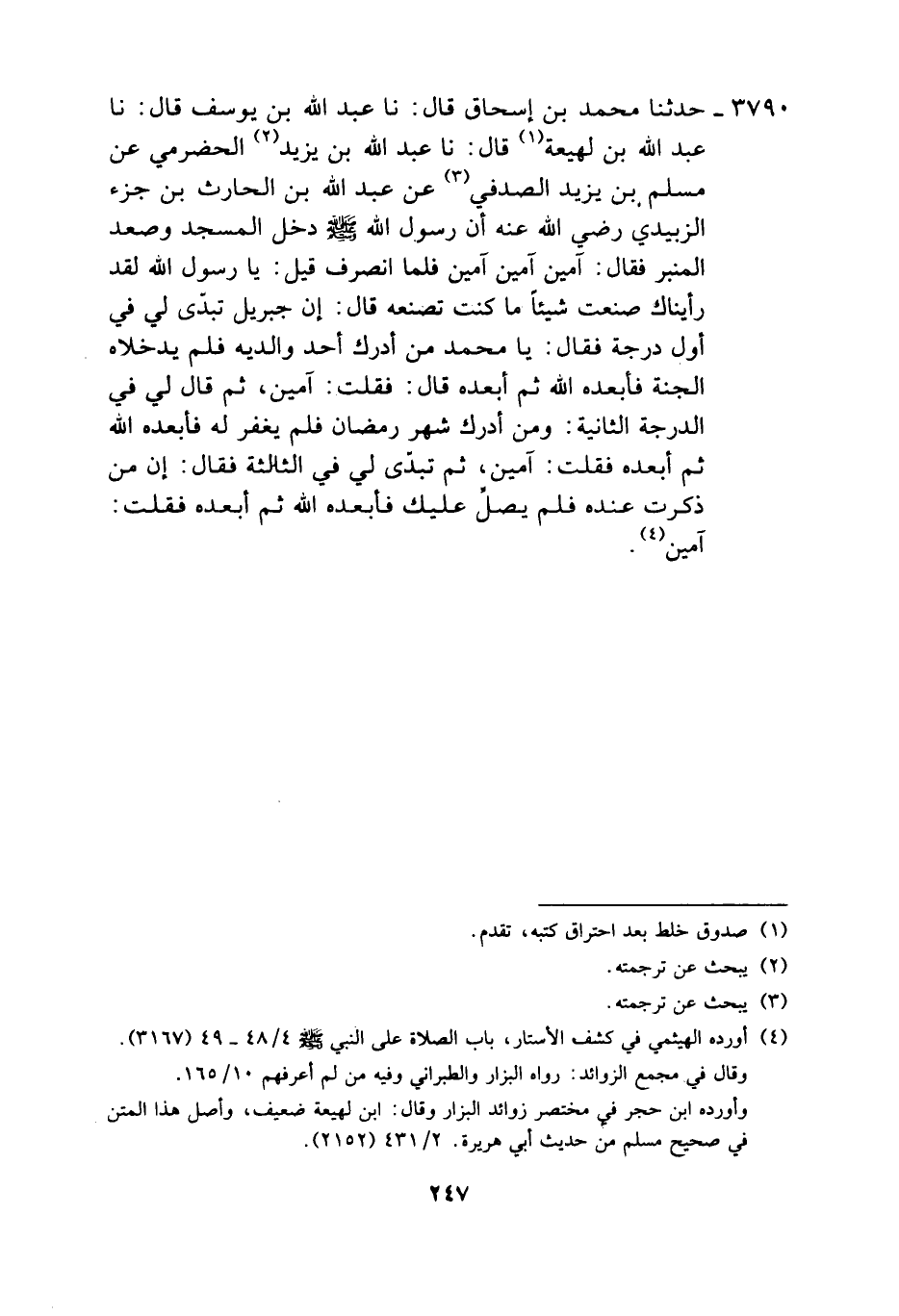 3790 - حَدَّثَنَا مُحَمَّدُ بْنُ إِسْحَاقَ، قَالَ: نَا عَبْدُ اللَّهِ بْنُ يُوسُفَ، قَالَ: نَا عَبْدُ اللَّهِ بْنُ لَهِيعَةَ، قَالَ: نَا عَبْدُ اللَّهِ بْنُ يَزِيدَ الْحَضْرَمِيُّ، عَنْ مُسْلِمِ بْنِ يَزِيدَ الصَّدَفِيِّ، عَنْ عَبْدِ اللَّهِ بْنِ الْحَارِثِ بْنِ جَزْءٍ الزُّبَيْدِيِّ رَضِيَ اللَّهُ عَنْهُ أَنَّ رَسُولَ اللَّهِ صَلَّى اللهُ عَلَيْهِ وَسَلَّمَ دَخَلَ الْمَسْجِدَ وَصَعِدَ الْمِنْبَرَ فَقَالَ: «آمِينَ، آمِينَ، آمِينَ» فَلَمَّا انْصَرَفَ قِيلَ: يَا رَسُولَ اللَّهِ، لَقَدْ رَأَيْنَاكَ صَنَعْتَ شَيْئًا مَا كُنْتَ تَصْنَعُهُ، قَالَ: " §إِنَّ جِبْرِيلَ تَبَدَّى لِي فِي أَوَّلِ دَرَجَةٍ، فَقَالَ: يَا مُحَمَّدُ، مَنْ أَدْرَكَ أَحَدَ وَالِدَيْهِ فَلَمْ يُدْخِلَاهُ الْجَنَّةَ فَأَبْعَدَهُ اللَّهُ ثُمَّ أَبْعَدَهُ، قَالَ: فَقُلْتُ: «آمِينَ» ثُمَّ قَالَ لِي فِي الدَّرَجَةِ الثَّانِيَةِ: وَمَنْ أَدْرَكَ شَهْرَ رَمَضَانَ فَلَمْ يُغْفَرْ لَهُ فَأَبْعَدَهُ اللَّهُ، ثُمَّ أَبْعَدَهُ، فَقُلْتُ: «آمِينَ» ثُمَّ تَبَدَّى لِي فِي الثَّالِثَةِ، فَقَالَ: إِنَّ مَنْ ذُكِرْتٌ عِنْدَهُ فَلَمْ يُصَلِّ عَلَيْكَ فَأَبْعَدَهُ اللَّهُ ثُمَّ أَبْعَدَهُ، فَقُلْتُ: آمِينَ "