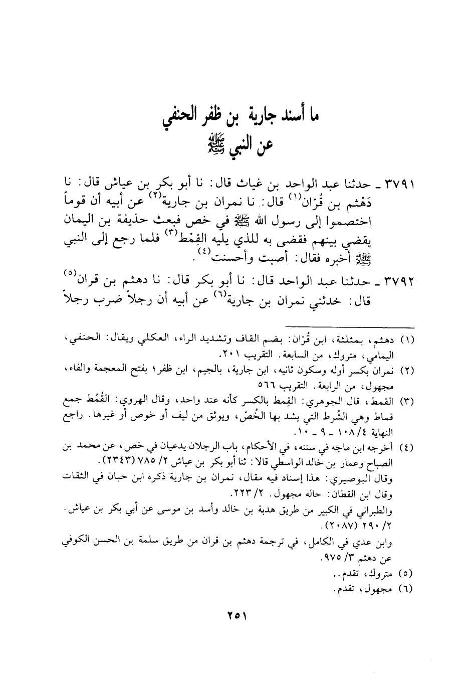 3791 - حَدَّثَنَا عَبْدُ الْوَاحِدِ بْنُ غِيَاثٍ، قَالَ: نَا أَبُو بَكْرِ بْنُ عَيَّاشٍ، قَالَ: نَا دَهْثَمُ بْنُ قُرَّانَ، قَالَ: نَا نِمْرَانُ بْنُ جَارِيَةَ، عَنْ أَبِيهِ، §أَنَّ قَوْمًا، اخْتَصَمُوا إِلَى رَسُولِ اللَّهِ صَلَّى اللهُ عَلَيْهِ وَسَلَّمَ فِي خُصٍّ فَبَعَثَ حُذَيْفَةَ بْنَ الْيَمَانِ يَقْضِي بَيْنَهُمْ فَقَضَى بِهِ لِلَّذِي يَلِيهِ الْقِمْطُ، فَلَمَّا رَجَعَ إِلَى النَّبِيِّ صَلَّى اللهُ عَلَيْهِ وَسَلَّمَ أَخْبَرَهُ فَقَالَ: «أَصَبْتَ وَأَحْسَنْتَ»