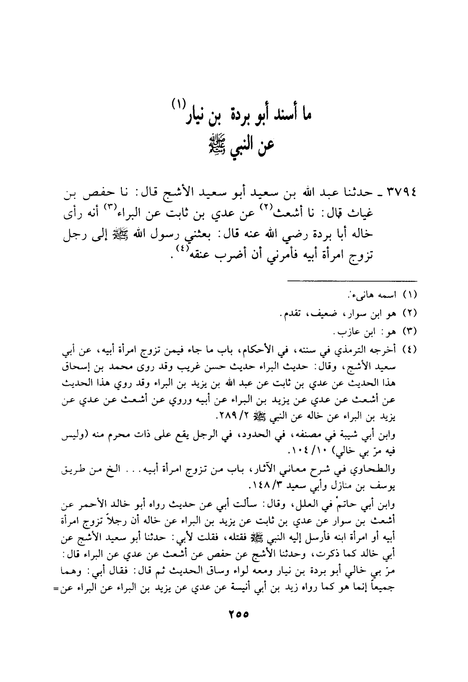 3794 - حَدَّثَنَا عَبْدُ اللَّهِ بْنُ سَعِيدٍ أَبُو سَعِيدٍ الْأَشَجُّ، قَالَ: نَا حَفْصُ بْنُ غِيَاثٍ، قَالَ: نَا أَشْعَثُ، عَنْ عَدِيِّ بْنِ ثَابِتٍ، عَنِ الْبَرَاءِ، أَنَّهُ رَأَى خَالَهُ أَبَا بُرْدَةَ رَضِيَ اللَّهُ عَنْهُ، قَالَ: بَعَثَنِي رَسُولُ اللَّهِ صَلَّى اللهُ عَلَيْهِ وَسَلَّمَ إِلَى رَجُلٍ تَزَوَّجَ امْرَأَةَ أَبِيهِ §فَأَمَرَنِي أَنْ أَضْرِبَ عُنُقَهُ