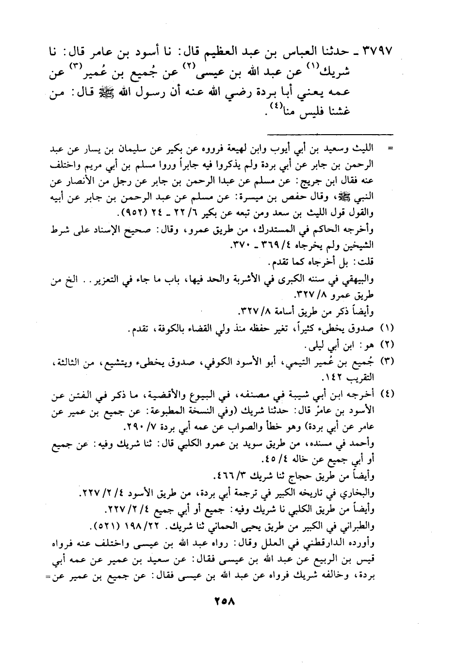 3797 - حَدَّثَنَا الْعَبَّاسُ بْنُ عَبْدِ الْعَظِيمِ، قَالَ: نَا أَسْوَدُ بْنُ عَامِرٍ، قَالَ: نَا شَرِيكٌ، عَنْ عَبْدِ اللَّهِ بْنِ عِيسَى، عَنْ جُمَيْعِ بْنِ عُمَيْرٍ، عَنْ عَمِّهِ يَعْنِي أَبَا بُرْدَةَ، رَضِيَ اللَّهُ عَنْهُ أَنَّ رَسُولَ اللَّهِ صَلَّى اللهُ عَلَيْهِ وَسَلَّمَ، قَالَ: «§مَنْ غَشَّنَا فَلَيْسَ مِنَّا»