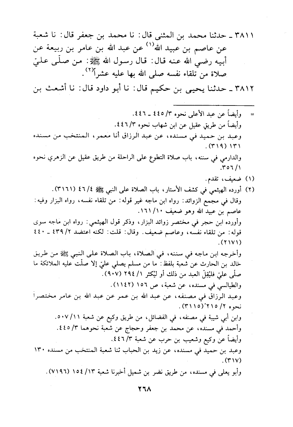 3811 - حَدَّثَنَا مُحَمَّدُ بْنُ الْمُثَنَّى، قَالَ: نَا مُحَمَّدُ بْنُ جَعْفَرٍ، قَالَ: نَا شُعْبَةُ، عَنْ عَاصِمِ بْنِ عُبَيْدِ اللَّهِ، عَنْ عَبْدِ اللَّهِ بْنِ عَامِرِ بْنِ رَبِيعَةَ، عَنْ أَبِيهِ رَضِيَ اللَّهُ عَنْهُ، قَالَ: قَالَ رَسُولُ اللَّهِ صَلَّى اللهُ عَلَيْهِ وَسَلَّمَ ": «§مَنْ صَلَّى عَلَيَّ صَلَاةً مِنْ تِلْقَاءِ نَفْسِهِ صَلَّى اللَّهُ بِهَا عَلَيْهِ عَشْرًا»