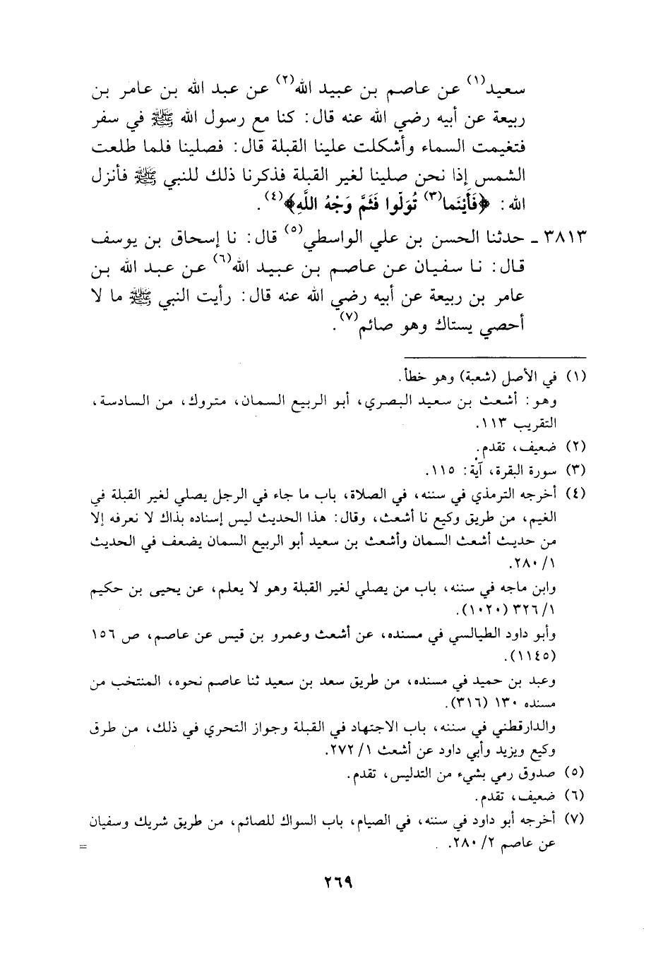 3813 - حَدَّثَنَا الْحَسَنُ بْنُ عَلِيٍّ الْوَاسِطِيُّ، قَالَ: نَا إِسْحَاقُ بْنُ يُوسُفَ، قَالَ: نَا سُفْيَانُ، عَنْ عَاصِمِ بْنِ عُبَيْدِ اللَّهِ، عَنْ عَبْدِ اللَّهِ بْنِ عَامِرِ بْنِ رَبِيعَةَ، عَنْ أَبِيهِ رَضِيَ اللَّهُ عَنْهُ، قَالَ: «§رَأَيْتُ النَّبِيَّ صَلَّى اللهُ عَلَيْهِ وَسَلَّمَ مَا لَا أُحْصِي يَسْتَاكُ وَهُوَ صَائِمٌ»