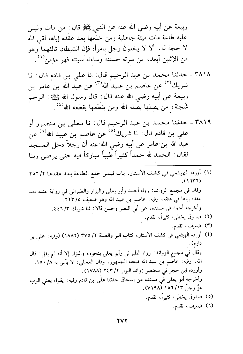 3818 - حَدَّثَنَا مُحَمَّدُ بْنُ عَبْدِ الرَّحِيمِ، قَالَ: نَا عَلِيُّ بْنُ قَادِمٍ، قَالَ: نَا شَرِيكٌ، عَنْ عَاصِمِ بْنِ عُبَيْدِ اللَّهِ، عَنْ عَبْدِ اللَّهِ بْنِ عَامِرِ بْنِ رَبِيعَةَ، عَنْ أَبِيهِ رَضِيَ اللَّهُ عَنْهُ، قَالَ: قَالَ رَسُولُ اللَّهِ صَلَّى اللهُ عَلَيْهِ وَسَلَّمَ ": «§الرَّحِمُ شُجْنَةٌ مَنْ يَصِلْهَا يَصِلْهُ اللَّهُ، وَمَنْ يَقْطَعْهَا يَقْطَعْهُ اللَّهُ»