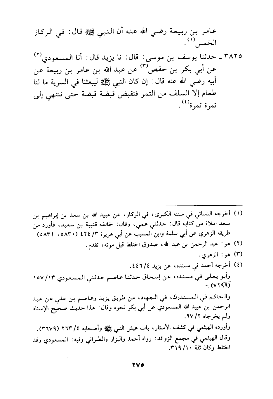 3825 - حَدَّثَنَا يُوسُفُ بْنُ مُوسَى، قَالَ: نَا يَزِيدُ، قَالَ: أَنَا الْمَسْعُودِيُّ، عَنْ أَبِي بَكْرِ بْنِ حَفْصٍ، عَنْ عَبْدِ اللَّهِ بْنِ عَامِرِ بْنِ رَبِيعَةَ، عَنْ أَبِيهٍ رَضِيَ اللَّهُ عَنْهُ، قَالَ: «§إِنْ كَانَ النَّبِيُّ صَلَّى اللهُ عَلَيْهِ وَسَلَّمَ لَيَبْعَثُنَا فِي السَّرِيَّةِ مَا لَنَا طَعَامٌ إِلَّا السَّلَفُ مِنَ التَّمْرِ فَنَقَبْضُ قَبْضَةً قَبْضَةً حَتَّى نَنْتَهِيَ إِلَى تَمْرَةٍ تَمْرَةٍ»