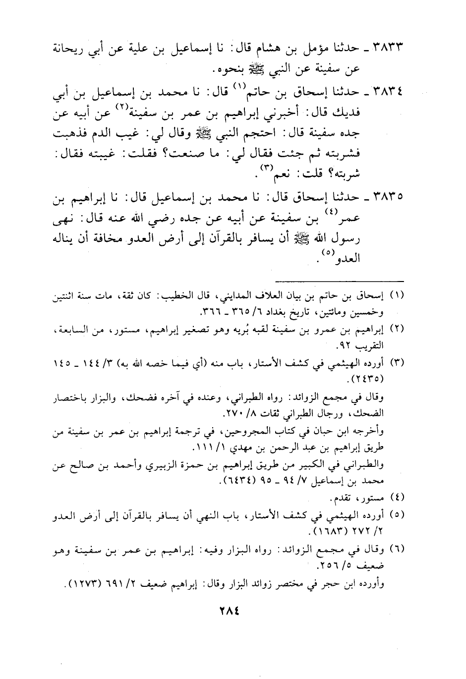 3834 - حَدَّثَنَا إِسْحَاقُ بْنُ حَاتِمٍ، قَالَ: نَا مُحَمَّدُ بْنُ إِسْمَاعِيلَ بْنِ أَبِي فُدَيْكٍ، قَالَ: أَخْبَرَنِي إِبْرَاهِيمُ بْنُ عُمَرَ بْنِ سَفِينَةَ، عَنْ أَبِيهِ، عَنْ جَدِّهِ سَفِينَةَ، قَالَ: احْتَجَمَ النَّبِيُّ صَلَّى اللهُ عَلَيْهِ وَسَلَّمَ، وَقَالَ لِي: «§غَيِّبِ الدَّمَ فَذَهَبْتُ فَشَرِبْتُهُ» ثُمَّ جِئْتُ فَقَالَ لِي: «مَا صَنَعْتَ؟» فَقُلْتُ: غَيَّبْتُهُ، فَقَالَ: «شَرِبْتَهُ؟» قُلْتُ: نَعَمْ