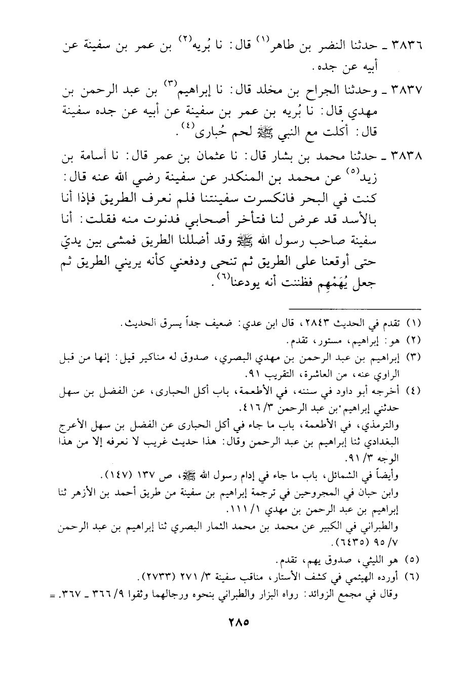 3838 - حَدَّثَنَا مُحَمَّدُ بْنُ بَشَّارٍ، قَالَ: نَا عُثْمَانُ بْنُ عُمَرَ، قَالَ: نَا أُسَامَةُ بْنُ زَيْدٍ، عَنْ مُحَمَّدِ بْنِ الْمُنْكَدِرِ، عَنْ سَفِينَةَ، رَضِيَ اللَّهُ عَنْهُ، قَالَ: " §كُنْتُ فِي الْبَحْرِ فَانْكَسَرَتْ سَفِينَتُنَا فَلَمْ نَعْرِفِ الطَّرِيقَ، فَإِذَا أَنَا بِالْأَسَدِ قَدْ عَرَضَ لَنَا فَتَأَخَّرَ أَصْحَابِي فَدَنَوْتُ مِنْهُ فَقُلْتُ: أَنَا سَفِينَةُ صَاحِبُ رَسُولِ اللَّهِ صَلَّى اللهُ عَلَيْهِ وَسَلَّمَ وَقَدْ أَضْلَلْنَا الطَّرِيقَ فَمَشَى بَيْنَ يَدَيَّ حَتَّى أَوْقَعَنَا عَلَى الطَّرِيقِ ثُمَّ تَنَحَّى وَدَفَعَنِي كَأَنَّهُ يُرِينِي الطَّرِيقَ، ثُمَّ جَعَلَ يُهِمَّهُمْ فَظَنَنْتُ أَنَّهُ يُوَدِّعُنَا "