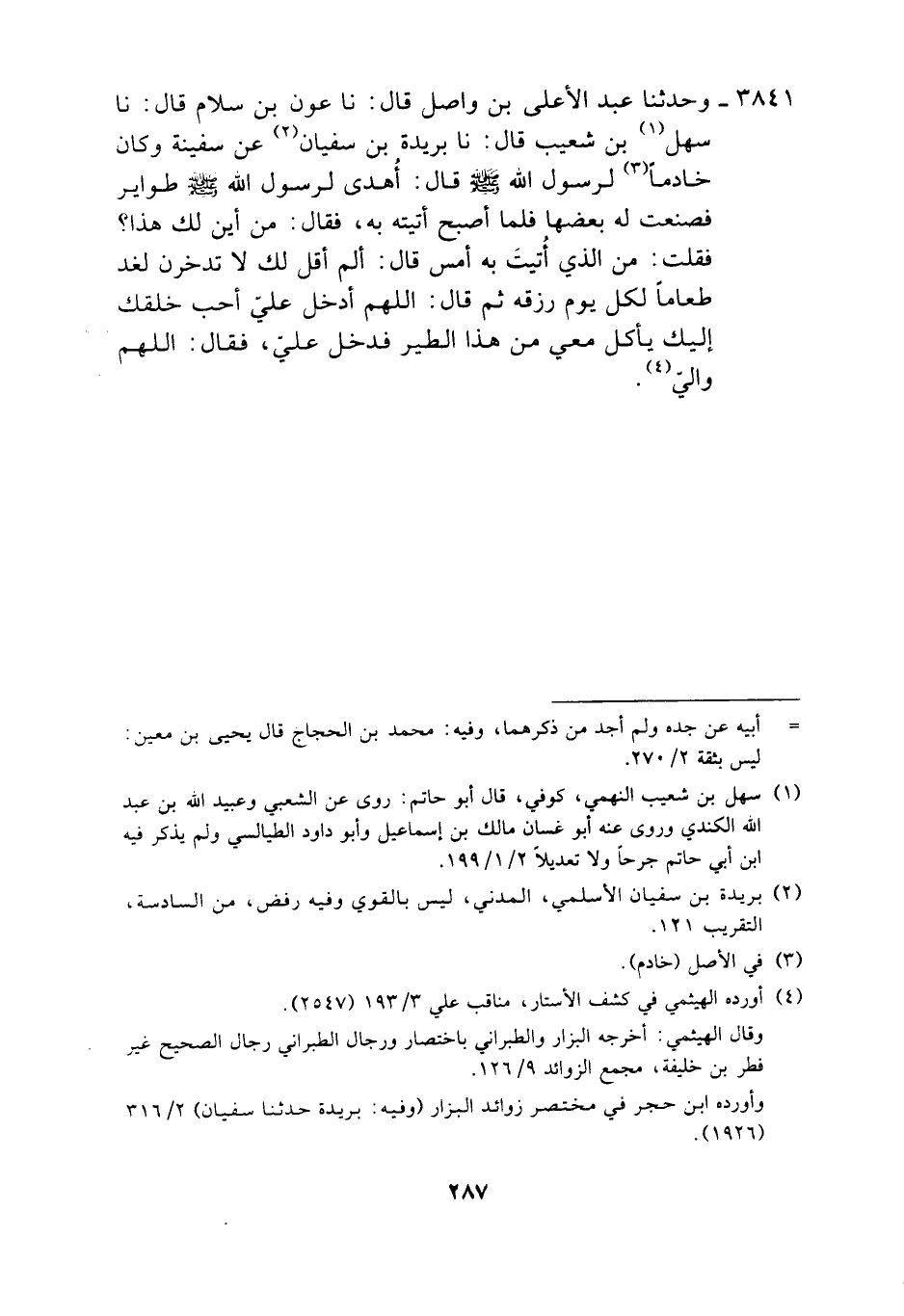 3841 - وَحَدَّثَنَا عَبْدُ الْأَعْلَى بْنُ وَاصِلٍ، قَالَ: نَا عَوْنُ بْنُ سَلَّامٍ، قَالَ: نَا سَهْلُ بْنُ شُعَيْبٍ، قَالَ: نَا بُرَيْدَةُ بْنُ سُفْيَانَ، عَنْ سَفِينَةَ، وَكَانَ خَادِمًا لِرَسُولِ اللَّهِ صَلَّى اللهُ عَلَيْهِ وَسَلَّمَ، قَالَ: أُهْدِيَ لِرَسُولِ اللَّهِ صَلَّى اللهُ عَلَيْهِ وَسَلَّمَ طَوَايِرُ فَصَنَعْتُ لَهُ بَعْضَهَا، فَلَمَّا أَصْبَحَ أَتَيْتُهُ بِهِ فَقَالَ: «مِنْ أَيْنَ لَكَ هَذَا؟» فَقُلْتُ: مِنَ الَّذِي أُتِيتَ بِهِ أَمْسِ، قَالَ: «أَلَمْ أَقُلْ لَكَ §لَا تَدَّخِرَنَّ لِغَدٍ طَعَامًا لِكُلِّ يَوْمٍ رِزْقُهُ؟» ثُمَّ، قَالَ: «اللَّهُمَّ أَدْخِلْ عَلَيَّ أَحَبَّ خَلْقِكَ إِلَيْكَ يَأْكُلُ مَعِي مِنْ هَذَا الطَّيْرِ» فَدَخَلَ عَلِيٌّ، فَقَالَ: «اللَّهُمَّ وَإِلَيَّ»