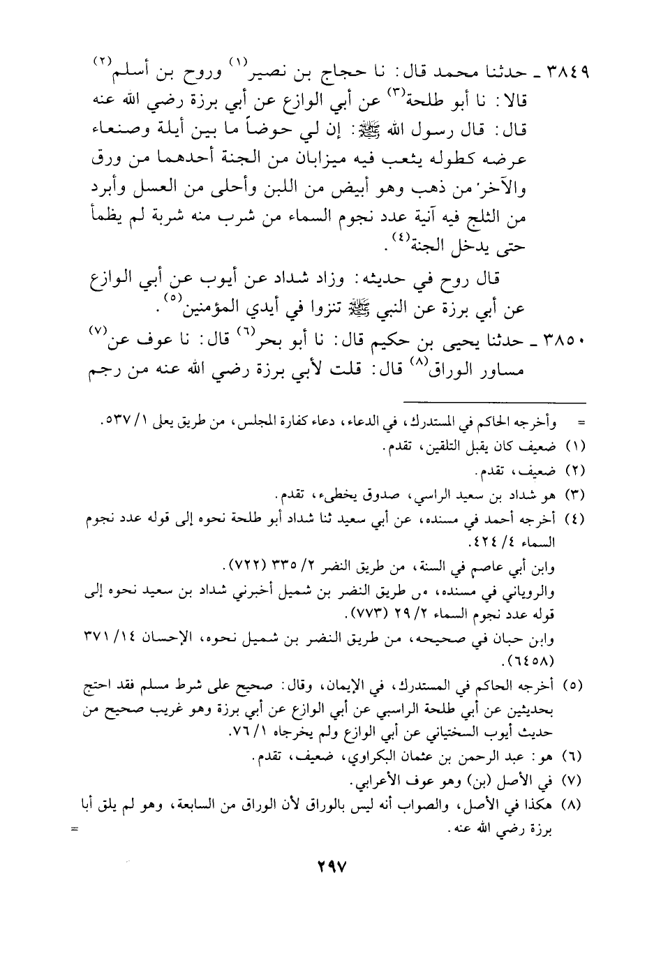 3849 - حَدَّثَنَا مُحَمَّدُ بْنُ مَعْمَرٍ، قَالَ: نَا رَوْحُ بْنُ أَسْلَمَ، وَالْحَجَّاجُ بْنُ نُصَيْرٍ، قَالَا: نَا أَبُو طَلْحَةَ وَهُوَ شَدَّادُ بْنُ سَعِيدٍ، عَنْ أَبِي الْوَازِعِ، عَنْ أَبِي بَرْزَةَ، رَضِيَ اللَّهُ عَنْهُ، قَالَ: قَالَ رَسُولُ اللَّهِ صَلَّى اللهُ عَلَيْهِ وَسَلَّمَ ": «§إِنَّ لِي حَوْضًا مَا بَيْنَ أَيْلَةَ وَصَنْعَاءَ عَرْضُهُ كَطُولِهِ يَثْعَبُ فِيهِ مِيزَابَانِ مِنَ الْجَنَّةِ أَحَدُهُمَا مِنْ وَرِقٍ وَالْآخَرُ مِنْ ذَهَبٍ وَهُوَ أَبْيَضُ مِنَ اللَّبَنِ وَأَحْلَى مِنَ الْعَسَلِ وَأَبْرَدُ مِنَ الثَّلْجِ فِيهِ آنِيَةٌ عَدَدَ نُجُومِ السَّمَاءِ مَنْ شَرِبَ مِنْهُ شَرْبَةً لَمْ يَظْمَأْ حَتَّى يَدْخُلَ الْجَنَّةَ» قَالَ رَوْحٌ فِي حَدِيثِهِ: وَزَادَ شَدَّادُ بْنُ سَعِيدٍ، عَنْ أَيُّوبَ، عَنْ أَبِي الْوَازِعِ، عَنْ أَبِي بَرْزَةَ، عَنِ النَّبِيِّ صَلَّى اللهُ عَلَيْهِ وَسَلَّمَ، قَالَ: «تَنْزُو فِي أَيْدِي الْمُؤْمِنِينَ»