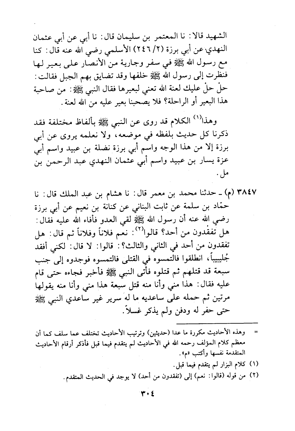 حَدَّثَنَا مُحَمَّدُ بْنُ مَعْمَرٍ، قَالَ: نَا هِشَامُ بْنُ عَبْدِ الْمَلِكِ، قَالَ: نَا حَمَّادُ بْنُ سَلَمَةَ، عَنْ ثَابِتٍ الْبُنَانِيِّ، عَنْ كِنَانَةَ بْنِ نُعَيْمٍ، عَنْ أَبِي بَرْزَةَ، رَضِيَ اللَّهُ عَنْهُ أَنَّ رَسُولَ اللَّهِ صَلَّى اللهُ عَلَيْهِ وَسَلَّمَ لَقِيَ الْعَدُوَّ فَأَفَاءَ اللَّهُ عَلَيْهِ فَقَالَ: «هَلْ تَفْقِدُونَ مِنْ أَحَدٍ؟» قَالُوا: نَعَمْ، فُلَانًا وَفُلَانًا، ثُمَّ قَالَ: «هَلْ تَفْقِدُونَ مِنْ أَحَدٍ فِي الثَّانِي وَالثَّالِثِ؟» قَالُوا: لَا، قَالَ: «لَكِنِّي أَفْقِدُ جُلَيْبِيبًا انْطَلِقُوا فَالْتَمَسُوهُ فِي الْقَتْلَى» فَالْتَمَسُوهُ فَوَجَدُوهُ إِلَى جَنْبِ سَبْعَةٍ قَدْ قَتَلَهُمْ، ثُمَّ قَتَلُوهُ فَأَتَى النَّبِيَّ صَلَّى اللهُ عَلَيْهِ وَسَلَّمَ فَأُخْبِرَ فَجَاءَهُ حَتَّى قَامَ عَلَيْهِ، فَقَالَ: «§هَذَا مِنِّي وَأَنَا مِنْهُ قَتَلَ سَبْعَةً، هَذَا مِنِّي وَأَنَا مِنْهُ» يَقُولُهَا مَرَّتَيْنِ، ثُمَّ حَمَلَهُ عَلَى سَاعِدَيْهِ مَا لَهُ سَرِيرٌ غَيْرُ سَاعِدَيِ النَّبِيِّ صَلَّى اللهُ عَلَيْهِ وَسَلَّمَ حَتَّى حُفِرَ لَهُ وَدُفِنَ وَلَمْ يَذْكُرْ غُسْلًا -[305]- وَهَذَا الْحَدِيثُ لَا نَعْلَمُ رَوَاهُ إِلَّا أَبُو بَرْزَةَ وَلَا نَعْلَمُ لَهُ طَرِيقًا، عَنْ أَبِي بَرْزَةَ إِلَّا هَذَا الطَّرِيقَ