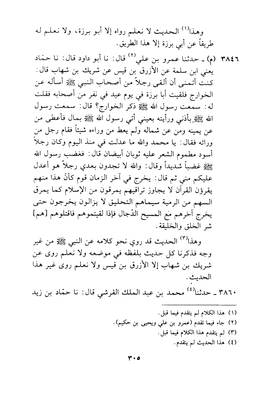 حَدَّثَنَا عَمْرُو بْنُ عَلِيٍّ، قَالَ: نَا أَبُو دَاوُدَ، قَالَ: نَا حَمَّادٌ يَعْنِي ابْنَ سَلَمَةَ، عَنِ الْأَزْرَقِ بْنِ قَيْسٍ، عَنْ شَرِيكِ بْنِ شِهَابٍ، قَالَ: كُنْتُ أَتَمَنَّى أَنْ أَلْقَى رَجُلًا مِنْ أَصْحَابِ النَّبِيِّ صَلَّى اللهُ عَلَيْهِ وَسَلَّمَ أَسْأَلُهُ، عَنِ الْخَوَارِجِ فَلَقِيتُ أَبَا بَرْزَةَ فِي يَوْمِ عِيدٍ فِي نَفَرٍ مِنْ أَصْحَابِهِ، فَقُلْتُ لَهُ: سَمِعْتُ رَسُولَ اللَّهِ صَلَّى اللهُ عَلَيْهِ وَسَلَّمَ ذَكَرَ الْخَوَارِجَ، قَالَ سَمِعْتُ رَسُولَ اللَّهِ صَلَّى اللهُ عَلَيْهِ وَسَلَّمَ بِأُذُنِي وَرَأَيْتُهُ بِعَيْنَيَّ أُتِيَ رَسُولُ اللَّهِ صَلَّى اللهُ عَلَيْهِ وَسَلَّمَ بِمَالٍ فَأَعْطَى مَنْ عَنْ يَمِينِهِ وَمَنْ عَنْ شِمَالِهِ وَلَمْ يُعْطِ مَنْ وَرَاءَهُ شَيْئًا، فَقَامَ رَجُلٌ مِنْ وَرَائِهِ فَقَالَ: يَا مُحَمَّدُ، وَاللَّهِ مَا عَدَلْتَ فِيَّ مُنْذُ الْيَوْمِ، وَكَانَ رَجُلًا أَسْوَدَ مَطْمُومَ الشَّعْرِ عَلَيْهِ ثَوْبَانِ أَبْيَضَانِ، قَالَ: فَغَضِبَ رَسُولُ اللَّهِ صَلَّى اللهُ عَلَيْهِ وَسَلَّمَ غَضَبًا شَدِيدًا وَقَالَ: «وَاللَّهِ لَا تَجِدُونَ بَعْدِي رَجُلًا هُوَ أَعْدَلُ عَلَيْكُمْ مِنِّي» ثُمَّ قَالَ: «§يَخْرُجُ فِي آخِرِ الزَّمَانِ قَوْمٌ كَأَنَّ هَذَا مِنْهُمْ، يَقْرَءُونَ الْقُرْآنَ لَا يُجَاوِزُ تَرَاقِيَهُمْ يَمْرُقُونَ مِنَ الْإِسْلَامِ كَمَا يَمْرُقُ السَّهْمَ مِنَ الرَّمِيَّةِ، سِيمَاهُمُ التَّحْلِيقُ، لَا يَزَالُونَ يَخْرُجُونَ حَتَّى يَخْرُجَ آخِرُهُمْ مَعَ الْمَسِيحِ الدَّجَّالِ، فَإِذَا لَقِيتُمُوهُمْ فَاقْتُلُوهُمْ هُمْ شَرُّ الْخَلْقِ وَالْخَلِيقَةِ» وَهَذَا الْحَدِيثُ قَدْ رُوِيَ نَحْوُ كَلَامِهِ، عَنِ النَّبِيِّ صَلَّى اللهُ عَلَيْهِ وَسَلَّمَ مِنْ غَيْرِ وَجْهٍ فَذَكَرْنَا كُلَّ حَدِيثٍ بِلَفْظِهِ فِي مَوْضِعِهِ وَلَا نَعْلَمُ رَوَى عَنْ شَرِيكِ بْنِ شِهَابٍ إِلَّا الْأَزْرَقُ بْنُ قَيْسٍ وَلَا نَعْلَمُ رَوَى غَيْرَ هَذَا الْحَدِيثِ