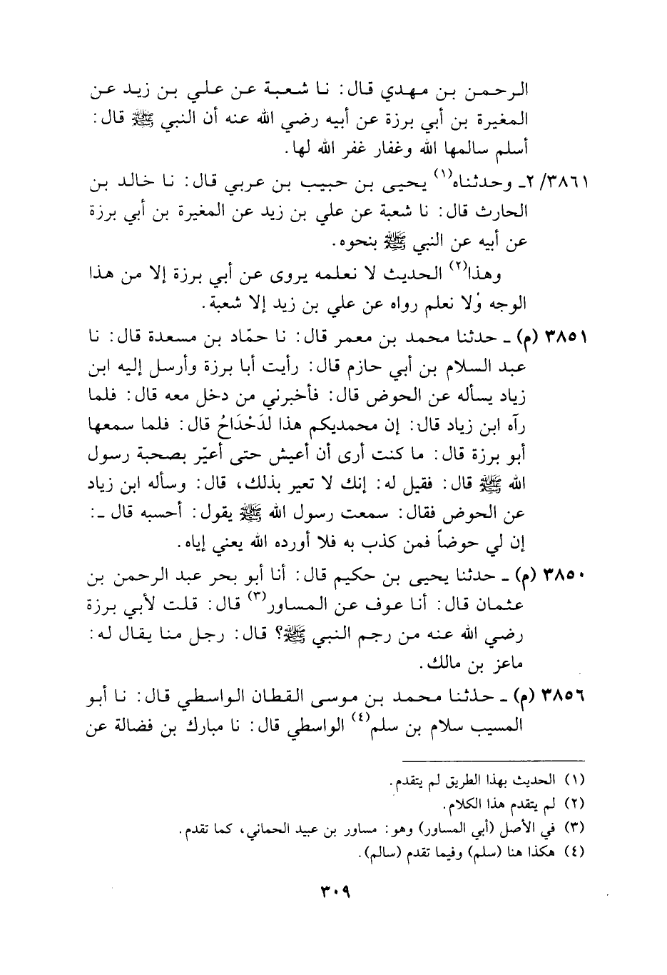 حَدَّثَنَا مُحَمَّدُ بْنُ مَعْمَرٍ، قَالَ: نَا حَمَّادُ بْنُ مَسْعَدَةَ، قَالَ: نَا عَبْدُ السَّلَامِ بْنُ أَبِي حَازِمٍ، قَالَ: رَأَيْتُ أَبَا بَرْزَةَ وَأَرْسَلَ إِلَيْهِ ابْنُ زِيَادٍ يَسْأَلُهُ عَنِ الْحَوْضِ، قَالَ: فَأَخْبَرَنِي مَنْ، دَخَلَ مَعَهُ قَالَ: فَلَمَّا رَآهُ ابْنُ زِيَادٍ، قَالَ: إِنَّ مُحَمَّدِيَّكُمْ هَذَا لَدَحْدَاحٌ، قَالَ: فَلَمَّا سَمِعَهَا أَبُو بَرْزَةَ، قَالَ: مَا كُنْتُ أَرَى أَنْ أَعِيشَ حَتَّى أُعَيَّرَ بِصُحْبَةِ رَسُولِ اللَّهِ صَلَّى اللهُ عَلَيْهِ وَسَلَّمَ، قَالَ: فَقِيلَ لَهُ: إِنَّكَ لَا تُعَيَّرُ بِذَلِكَ، قَالَ: وَسَأَلَهُ ابْنُ زِيَادٍ عَنِ الْحَوْضِ، فَقَالَ: سَمِعْتُ رَسُولَ اللَّهِ صَلَّى اللهُ عَلَيْهِ وَسَلَّمَ يَقُولُ: أَحْسَبُهُ، قَالَ: «§إِنَّ لِي حَوْضًا فَمَنْ كَذَّبَ بِهِ فَلَا أَوْرَدَهُ اللَّهُ يَعْنِي إِيَّاهُ»