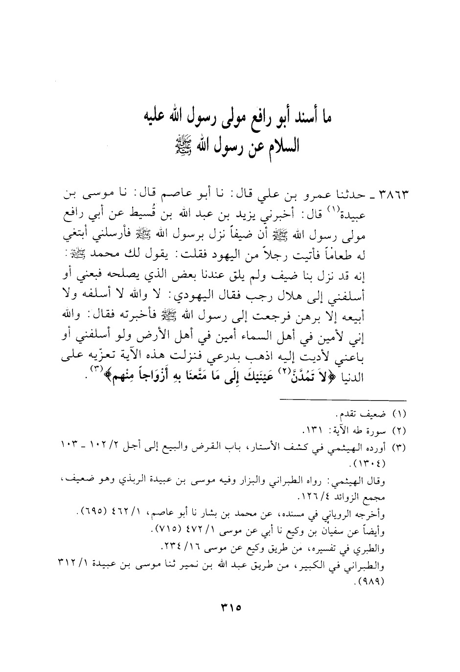 3863 - حَدَّثَنَا عَمْرُو بْنُ عَلِيٍّ، قَالَ: نَا أَبُو عَاصِمٍ، قَالَ: نَا مُوسَى بْنُ عُبَيْدَةَ، قَالَ: أَخْبَرَنِي يَزِيدُ بْنُ عَبْدِ اللَّهِ بْنِ قُسَيْطٍ، عَنْ أَبِي رَافِعٍ، مَوْلَى رَسُولِ اللَّهِ صَلَّى اللهُ عَلَيْهِ وَسَلَّمَ أَنَّ ضَيْفًا نَزَلَ بِرَسُولِ اللَّهِ صَلَّى اللهُ عَلَيْهِ وَسَلَّمَ فَأَرْسَلَنِي أَبْتَغِي لَهُ طَعَامًا فَأَتَيْتُ رَجُلًا مِنَ الْيَهُودِ فَقُلْتُ: يَقُولُ لَكَ مُحَمَّدٌ صَلَّى اللهُ عَلَيْهِ وَسَلَّمَ: " إِنَّهُ قَدْ نَزَلَ بِنَا ضَيْفٌ وَلَمْ يَلْقَ عِنْدَنَا بَعْضَ الَّذِي يُصْلِحُهُ فَبِعْنِي أَوْ أَسْلِفْنِي إِلَى هِلَالِ رَجَبٍ فَقَالَ الْيَهُودِيُّ: لَا وَاللَّهِ لَا أُسْلِفُهُ وَلَا أَبِيعُهُ إِلَّا بِرَهْنٍ فَرَجَعْتُ إِلَى رَسُولِ اللَّهِ صَلَّى اللهُ عَلَيْهِ وَسَلَّمَ فَأَخْبَرْتُهُ فَقَالَ: «وَاللَّهِ §إِنِّي لَأَمِينٌ فِي أَهْلِ السَّمَاءِ، أَمِينٌ فِي أَهْلِ الْأَرْضِ، وَلَوْ أَسْلَفَنِي أَوْ بَاعَني لَأَدَّيْتُ إِلَيْهِ اذْهَبْ بِدِرْعِي» فَنَزَلَتْ هَذِهِ الْآيَةُ تُعَزِّيهِ عَلَى الدُّنْيَا {لَا تَمُدَّنَّ عَيْنَيْكَ إِلَى مَا مَتَّعْنَا بِهِ أَزْوَاجًا مِنْهُمْ} [الحجر: 88]