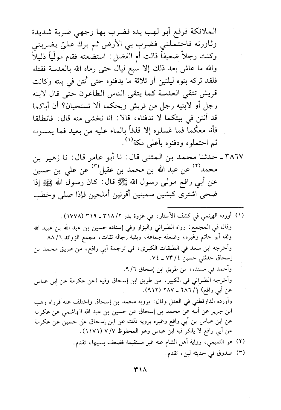 3867 - حَدَّثَنَا مُحَمَّدُ بْنُ الْمُثَنَّى، قَالَ: نَا أَبُو عَامِرٍ، قَالَ: نَا زُهَيْرُ بْنُ مُحَمَّدٍ، عَنْ عَبْدِ اللَّهِ بْنِ مُحَمَّدِ بْنِ عَقِيلٍ، عَنْ عَلِيِّ بْنِ حُسَيْنٍ، عَنْ أَبِي رَافِعٍ، مَوْلَى رَسُولِ اللَّهِ صَلَّى اللهُ عَلَيْهِ وَسَلَّمَ، قَالَ: كَانَ رَسُولُ اللَّهِ صَلَّى اللهُ عَلَيْهِ وَسَلَّمَ إِذَا ضَحَّى اشْتَرَى كَبْشَيْنِ سَمِينَيْنِ أَقْرَنَيْنِ أَمْلَحَيْنِ فَإِذَا صَلَّى وَخَطَبَ -[319]- أَتَى بِأَحَدِهِمَا وَهُوَ فِي مُصَلَّاهُ فَيَذْبَحُهُ ثُمَّ يَقُولُ: «اللَّهُمَّ §هَذَا عَنْ أُمَّتِي جَمِيعًا مِنْ شَهِدَ لَكَ بِالتَّوْحِيدِ وَشَهِدَ لِي بِالْبَلَاغِ» ثُمَّ يُؤْتَى بِالْآخَرِ فَيَذْبَحُهُ وَيَقُولُ: «هَذَا عَنْ مُحَمَّدٍ وَآلِ مُحَمَّدٍ» فَيُطْعِمُهُمَا جَمِيعًا الْمَسَاكِينَ وَيَأْكُلُ هُوَ وَأَهْلُهُ مِنْهُمَا قَالَ: فَلَبِثْنَا سِنَينًا لَيْسَ رَجُلٌ مِنْ بَنِي هَاشِمٍ يُضَحِّي قَدْ كَفَاهُ اللَّهُ بِرَسُولِ اللَّهِ عليه السلام الْمَؤُنَةَ وَالْغُرْمَ