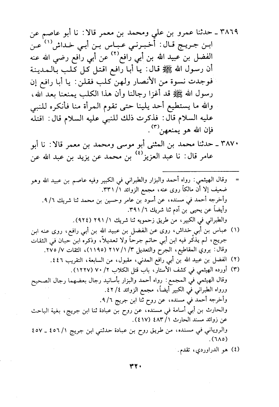 3869 - حَدَّثَنَا عَمْرُو بْنُ عَلِيٍّ، وَمُحَمَّدُ بْنُ مَعْمَرٍ، قَالَا: نَا أَبُو عَاصِمٍ، عَنِ ابْنِ جُرَيْجٍ، قَالَ: أَخْبَرَنِي عَبَّاسُ بْنُ أَبِي خِدَاشٍ، عَنِ الْفَضْلِ بْنِ عُبَيْدِ اللَّهِ بْنِ أَبِي رَافِعٍ، عَنْ أَبِي رَافِعٍ، رَضِيَ اللَّهُ عَنْهُ أَنَّ رَسُولَ اللَّهِ صَلَّى اللهُ عَلَيْهِ وَسَلَّمَ، قَالَ: «يَا أَبَا رَافِعٍ، §اقْتُلْ كُلَّ كَلْبٍ بِالْمَدِينَةِ» فَوَجَدْتُ نِسْوَةً مِنَ الْأَنْصَارِ وَلَهُنَّ كَلْبٌ فَقُلْنَ: يَا أَبَا رَافِعٍ، إِنَّ رَسُولَ اللَّهِ صَلَّى اللهُ عَلَيْهِ وَسَلَّمَ قَدْ أَغْزَا رِجَالَنَا، وَإِنَّ هَذَا الْكَلْبَ يَمْنَعُنَا بَعْدَ اللَّهِ، وَاللَّهِ مَا يَسْتَطِيعُ أَحَدٌ يَلِينَا حَتَّى تَقُومَ الْمَرْأَةُ مِنَّا، فَاذْكُرْهُ لِلنَّبِيِّ عَلَيْهِ السَّلَامُ، قَالَ: فَذَكَرْتُ ذَلِكَ لِلنَّبِيِّ عَلَيْهِ السَّلَامُ، قَالَ: «اقْتُلْهُ فَإِنَّ اللَّهَ هُوَ يَمْنَعُهُنَّ»