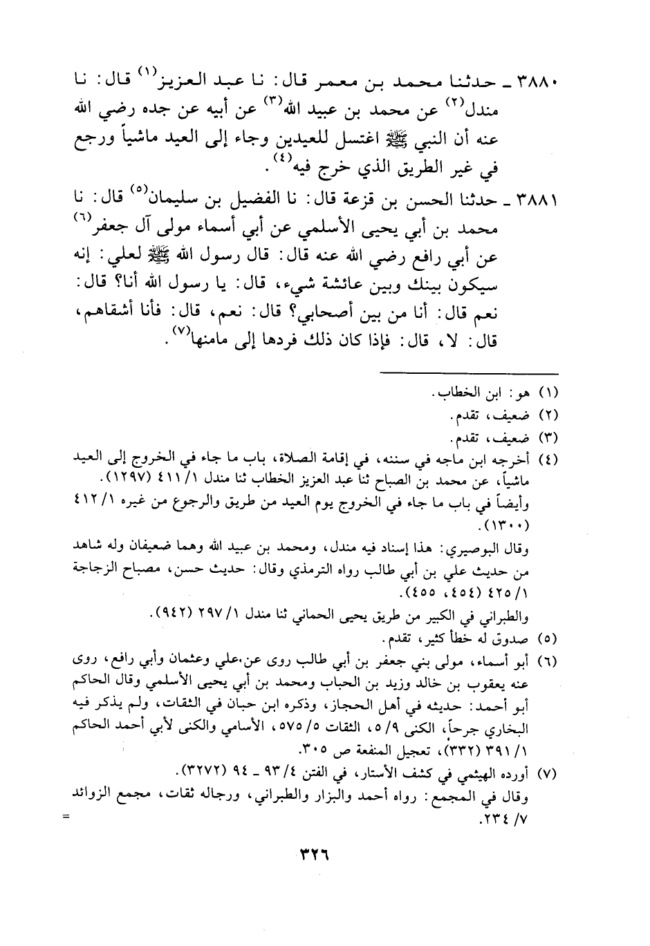3880 - حَدَّثَنَا مُحَمَّدُ بْنُ مَعْمَرٍ، قَالَ: نَا عَبْدُ الْعَزِيزِ، قَالَ: نَا مِنْدَلٌ، عَنْ مُحَمَّدِ بْنِ عُبَيْدِ اللَّهِ، عَنْ أَبِيهِ، عَنْ جَدِّهِ رَضِيَ اللَّهُ عَنْهُ «§أَنَّ النَّبِيَّ صَلَّى اللهُ عَلَيْهِ وَسَلَّمَ اغْتَسَلَ لِلْعِيدَيْنِ، وَجَاءَ إِلَى الْعِيدِ مَاشِيًا وَرَجَعَ فِي غَيْرِ الطَّرِيقِ الَّذِي خَرَجَ فِيهِ»