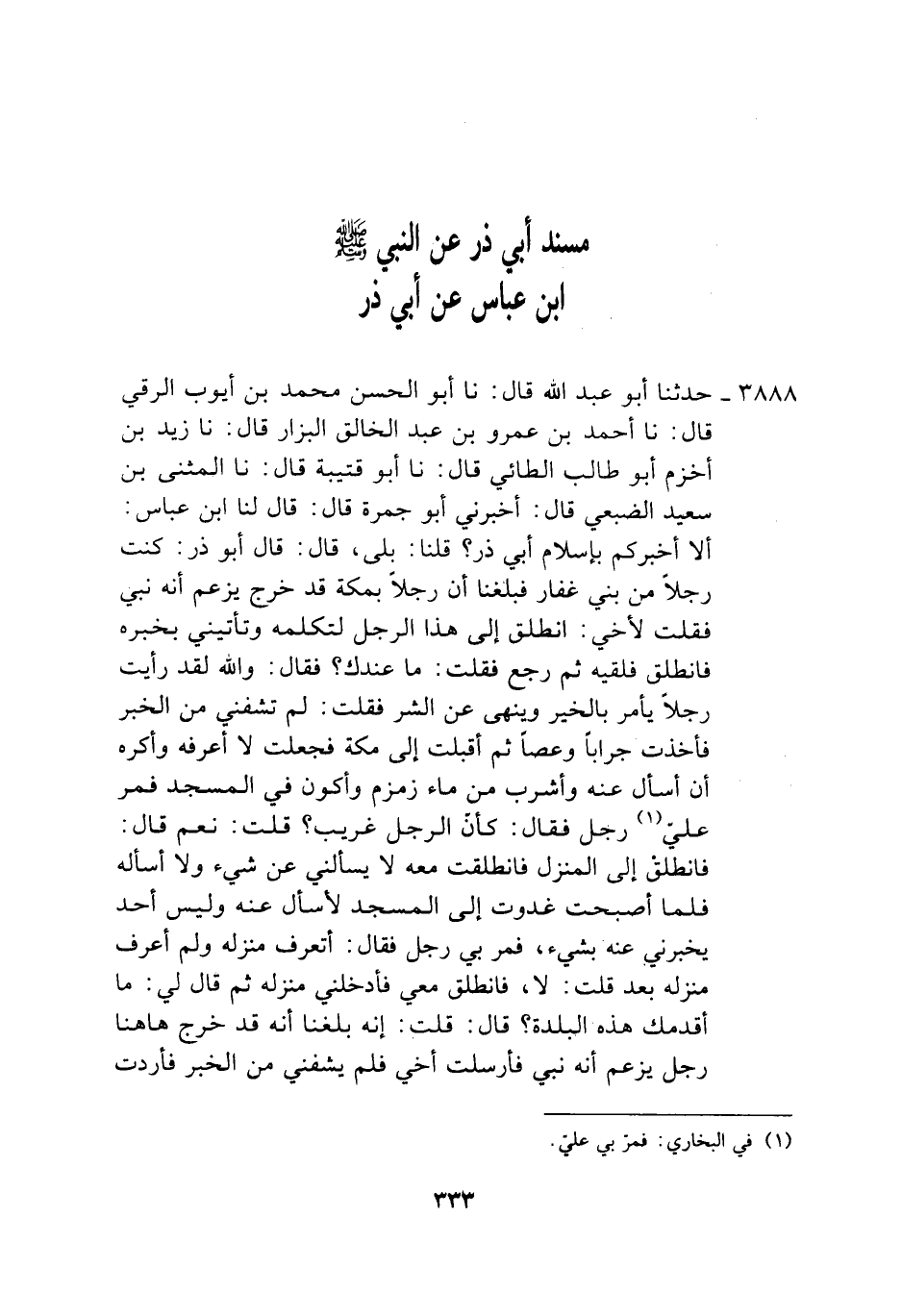 3888 - حَدَّثَنَا أَبُو عَبْدِ اللَّهِ، قَالَ: نَا أَبُو الْحَسَنِ مُحَمَّدُ بْنُ أَيُّوبَ الرَّقِّيُّ، قَالَ: نَا أَحْمَدُ بْنُ عَمْرِو بْنِ عَبْدِ الْخَالِقِ الْبَزَّارُ، قَالَ: نَا زَيْدُ بْنُ أَخْزَمَ أَبُو طَالِبٍ الطَّائِيُّ، قَالَ: نَا أَبُو قُتَيْبَةَ، قَالَ: نَا الْمُثَنَّى بْنُ سَعِيدٍ الضُّبَعِيُّ، قَالَ: أَخْبَرَنِي أَبُو جَمْرَةَ، قَالَ: قَالَ لَنَا ابْنُ عَبَّاسٍ: أَلَا أُخْبِرُكُمْ بِإِسْلَامِ أَبِي ذَرٍّ،؟ قُلْنَا: بَلَى، قَالَ: قَالَ أَبُو ذَرٍّ: كُنْتُ رَجُلًا مِنْ بَنِي غِفَارٍ فَبَلَغَنَا أَنَّ رَجُلًا بِمَكَّةَ قَدْ خَرَجَ يَزْعُمُ أَنَّهُ نَبِيٌّ، فَقُلْتُ لِأَخِي: انْطَلِقْ إِلَى هَذَا الرَّجُلِ لِتُكَلِّمَهُ وَتَأْتِيَنِي بِخَبَرِهِ، فَانْطَلَقَ فَلَقِيَهُ، ثُمَّ رَجَعَ، فَقُلْتُ: مَا عِنْدَكَ؟ فَقَالَ: وَاللَّهِ لَقَدْ رَأَيْتُ رَجُلًا يَأْمُرُ بِالْخَيْرِ وَيَنْهَى عَنِ الشَّرِّ، فَقُلْتُ: لَمْ تَشْفِنِي مِنَ الْخَبَرِ، فَأَخَذْتُ جِرَابًا وَعَصًا، ثُمَّ أَقْبَلْتُ إِلَى مَكَّةَ فَجَعَلْتُ لَا أَعْرِفُهُ وَأَكْرَهُ أَنْ أَسْأَلَ عَنْهُ وَأَشْرَبُ مِنْ مَاءِ زَمْزَمَ وَأَكُونُ فِي الْمَسْجِدِ فَمَرَّ عَلَيَّ رَجُلٌ فَقَالَ: كَأَنَّ الرَّجُلَ غَرِيبٌ، قُلْتُ: نَعَمْ، قَالَ: فَانْطَلِقْ إِلَى الْمَنْزِلِ فَانْطَلَقْتُ مَعَهُ لَا يَسْأَلُنِي عَنْ شَيْءٍ وَلَا أَسْأَلُهُ، فَلَمَّا أَصْبَحْتُ غَدَوْتُ إِلَى الْمَسْجِدِ لِأَسْأَلَ عَنْهُ وَلَيْسَ أَحَدٌ يُخْبِرُنِي عَنْهُ بِشَيْءٍ فَمَرَّ بِي رَجُلٌ، فَقَالَ: أَتَعْرِفُ مَنْزِلَهُ وَلَمْ أَعْرِفْ مَنْزِلَهُ بَعْدُ، قُلْتُ: لَا، فَانْطَلَقَ مَعِي فَأَدْخَلَنِي مَنْزِلَهُ، ثُمَّ قَالَ لِي: مَا أَقْدَمَكَ هَذِهِ الْبَلْدَةَ؟ قَالَ: قُلْتُ: إِنَّهُ بَلَغَنَا أَنَّهُ قَدْ خَرَجَ هَا هُنَا رَجُلٌ يَزْعُمُ أَنَّهُ نَبِيٌّ، فَأَرْسَلْتُ أَخِي فَلَمْ يَشْفِنِي مِنَ الْخَبَرِ فَأَرَدْتُ -[334]- أَنْ أَلْقَاهُ، فَقَالَ لِي: أَمَا إِنَّكَ قَدْ رَشَدْتَ، هَذَا وَجْهِي إِلَيْهِ فَاتْبَعْنِي فَادْخُلْ حَيْثُ أَدْخُلُ، فَإِنْ رَأَيْتَ أَحَدًا أَخَافُهُ عَلَيْكَ قُمْتُ وَرَاءَ الْحَائِطِ كَأَنِّي أُصْلِحُ نَعْلِي، وَامْضِ أَنْتَ فَمَضَى وَمَضَيْتُ مَعَهُ حَتَّى دَخَلَ وَدَخَلْتُ مَعَهُ، فَقُلْتُ: يَا رَسُولَ اللَّهِ، اعْرِضْ عَلَيَّ الْإِسْلَامَ، فَعَرَضَهُ عَلَيَّ فَأَسْلَمْتُ مَكَانِي، فَقَالَ لِي: «يَا أَبَا ذَرِّ، §ارْجِعْ إِلَى بَلَدِكَ، فَإِذَا بَلَغَكَ ظُهُورُنَا فَأَقْبِلْ» فَقُلْتُ: وَالَّذِي بَعَثَكَ بِالْحَقِّ، لَأَصْرُخَنَّ بِهَا بَيْنَ أَظْهُرِهِمْ فَجَاءَ إِلَى الْمَسْجِدِ وَقُرَيْشٌ فِيهِ فَقَالَ: يَا مَعْشَرَ قُرَيْشٍ، إِنِّي أَشْهَدُ أَنْ لَا إِلَهَ إِلَّا اللَّهُ وَأَشْهَدُ أَنَّ مُحَمَّدًا عَبْدُهُ وَرَسُولُهُ، فَقَالُوا: قُومُوا إِلَى هَذَا الصَّابِئِ، فَقَامُوا فَضَرَبْتُ إِلَى أَنْ أَمُوتَ وَأَدْرَكَنِي الْعَبَّاسُ فَأَكَبَّ عَلَيَّ وَقَالَ: " وَيْلَكُمْ تَقْتُلُونَ رَجُلًا مِنْ بَنِي غِفَارٍ وَمَتْجَرُكُمْ عَلَى غِفَارٍ فَأَقْلَعُوا عَنِّي، فَلَمَّا أَصْبَحْتُ غَدَوْتُ إِلَى الْمَسْجِدِ، فَقُلْتُ مِثْلَ مَا قُلْتُ بِالْأَمْسِ فَصُنِعَ بِي مِثْلَ مَا صُنِعَ بِالْأَمْسِ، فَأَدْرَكَنِي الْعَبَّاسُ فَأَكَبَّ عَلَيَّ، وَقَالَ: تَقْتُلُونَ رَجُلًا مِنْ بَنِي غِفَارٍ، وَقَالَ مِثْلَ مَقَالَتِهِ بِالْأَمْسِ، فَكَانَ هَذَا إِسْلَامَ أَبِي ذَرٍّ وَلَا نَعْلَمُ يُرْوَى عَنِ ابْنِ عَبَّاسٍ، عَنْ أَبِي ذَرٍّ فِي قِصَّةِ إِسْلَامِهِ إِلَّا مِنْ هَذَا الْوَجْهِ، وَالْمُثَنَّى بْنُ سَعِيدٍ هَذَا بَصْرِيُّ ثِقَةٌ، وَأَبُو جَمْرَةَ اسْمُهُ نَصْرُ بْنُ عِمْرَانَ