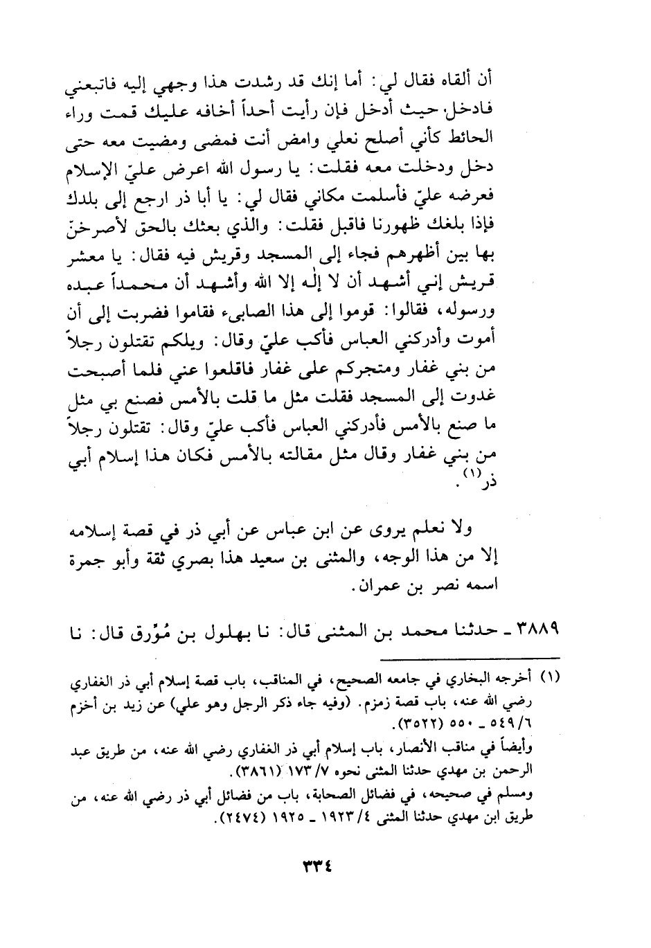 3889 - حَدَّثَنَا مُحَمَّدُ بْنُ الْمُثَنَّى، قَالَ: نَا بُهْلُولُ بْنُ مُوَرِّقٍ، قَالَ: نَا -[335]- مُوسَى بْنُ عُبَيْدَةَ، قَالَ: أَخْبَرَنِي الْوَلِيدُ بْنُ نُوَيْفِعٍ أَوْ نُفَيْعٍ، عَنْ عَبْدِ اللَّهِ بْنِ عَبَّاسٍ، أَنَّ أَبَا ذَرٍّ قَالَ: سَمِعْتُ رَسُولَ اللَّهِ صَلَّى اللهُ عَلَيْهِ وَسَلَّمَ يَقُولُ: «§إِنَّ أَحَبَّكُمْ إِلَيَّ وَأَقْرَبَكُمْ مِنِّي الَّذِي يَلْحَقُنِي عَلَى مَا عَاهَدْتُهُ عَلَيْهِ» وَهَذَا الْكَلَامُ لَا نَعْلَمُهُ يُرْوَى إِلَّا عَنْ أَبِي ذَرٍّ وَلَا نَعْلَمُ رَوَى عَنِ الْوَلِيدِ بْنِ نُوَيْفِعٍ إِلَّا مُوسَى بْنِ عُبَيْدَةَ، وَمُوسَى كَانَ مِنْ خِيَارِ النَّاسِ وَعُبَّادِهِمْ