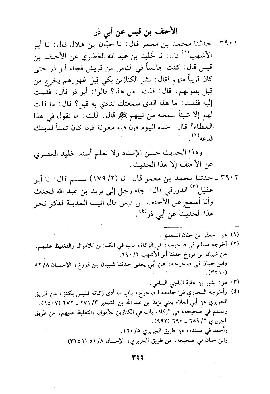 3901 - حَدَّثَنَا مُحَمَّدُ بْنُ مَعْمَرٍ، قَالَ: نَا حَبَّانُ بْنُ هِلَالٍ، قَالَ: نَا أَبُو الْأَشْهَبِ، قَالَ: نَا خُلَيْدُ بْنُ عَبْدِ اللَّهِ الْعَصَرِيُّ، عَنِ الْأَحْنَفِ بْنِ قَيْسٍ، قَالَ: كُنْتُ جَالِسًا فِي النَّاسِ مِنْ قُرَيْشٍ فَجَاءَ أَبُو ذَرٍّ حَتَّى كَانَ قَرِيبًا مِنْهُمْ، فَقَالَ: " §بَشِّرِ الْكَنَّازِينَ بِكَيِّ قِبَلَ ظُهُورِهِمْ يَخْرُجُ مِنْ قبَلِ بُطُونِهِمْ، قَالَ: قُلْتُ: مَنْ هَذَا؟ قَالُوا: أَبُو ذَرٍّ، قَالَ فَقُمْتُ إِلَيْهِ، فَقُلْتُ: مَا هَذَا الَّذِي سَمِعْتُكَ تُنَادِي بِهِ قَبْلُ؟ قَالَ: مَا قُلْتُ لَهُمْ إِلَّا شَيْئًا سَمِعْتُهُ مِنْ نَبِيِّهِمْ صَلَّى اللهُ عَلَيْهِ وَسَلَّمَ، قَالَ: قُلْتُ: مَا تَقُولُ فِي هَذَا الْعَطَاءِ؟ قَالَ: خُذْهُ الْيَوْمَ فَإِنَّ فِيهِ مَعُونَةً، فَإِذَا كَانَ ثَمَنًا لِدِينِكَ فَدَعْهُ وَهَذَا الْحَدِيثُ حَسَنُ الْإِسْنَادِ، وَلَا نَعْلَمُ أَسْنَدَ خُلَيْدٌ الْعَصَرِيُّ عَنِ الْأَحْنَفِ إِلَّا هَذَا الْحَدِيثَ حَدَّثَنَا مُحَمَّدُ بْنُ مَعْمَرٍ، قَالَ: نَا مُسْلِمٌ، قَالَ: نَا أَبُو عَقِيلٍ الدَّوْرَقِيُّ، قَالَ: جَاءَ رَجُلٌ إِلَى يَزِيدَ بْنِ عَبْدِ اللَّهِ فَحَدَّثَ وَأَنَا أَسْمَعُ عَنِ الْأَحْنَفِ بْنِ قَيْسٍ، قَالَ: أَتَيْتُ الْمَدِينَةَ فَذَكَرَ نَحْوَ هَذَا الْحَدِيثِ، عَنْ أَبِي ذَرٍّ
