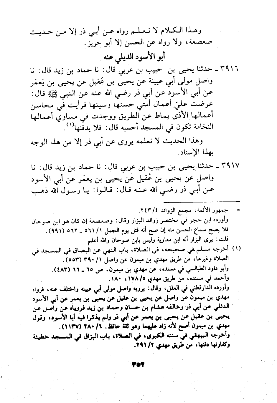 3916 - حَدَّثَنَا يَحْيَى بْنُ حَبِيبِ بْنِ عَرَبِيٍّ، قَالَ: نَا حَمَّادُ بْنُ زَيْدٍ، قَالَ: نَا وَاصِلٌ، مَوْلَى أَبِي عُيَيْنَةَ، عَنْ يَحْيَى بْنِ عَقِيلٍ، عَنْ يَحْيَى بْنِ يَعْمَرَ، عَنْ أَبِي الْأَسْوَدِ، عَنْ أَبِي ذَرٍّ، رَضِيَ اللَّهُ عَنْهُ، عَنِ النَّبِيِّ صَلَّى اللهُ عَلَيْهِ وَسَلَّمَ، قَالَ: «§عُرِضَتْ عَلَيَّ أَعْمَالُ أُمَّتِي حُسْنَهَا وَسَيِّئَهَا فَرَأَيْتُ فِيَ مَحَاسِنِ أَعْمَالِهَا الْأَذَى يُمَاطُ عَنِ الطَّرِيقِ، وَوَجَدْتُ فِي مَسَاوِي أَعْمَالِهَا النُّخَامَةَ تَكُونُ فِي الْمَسْجِدِ - أَحْسِبُهُ قَالَ - فَلَا يَدْفِنُهَا» وَهَذَا الْحَدِيثُ لَا نَعْلَمُهُ يُرْوَى عَنْ أَبِي ذَرٍّ إِلَّا مِنْ هَذَا الْوَجْهِ بِهَذَا الْإِسْنَادِ
