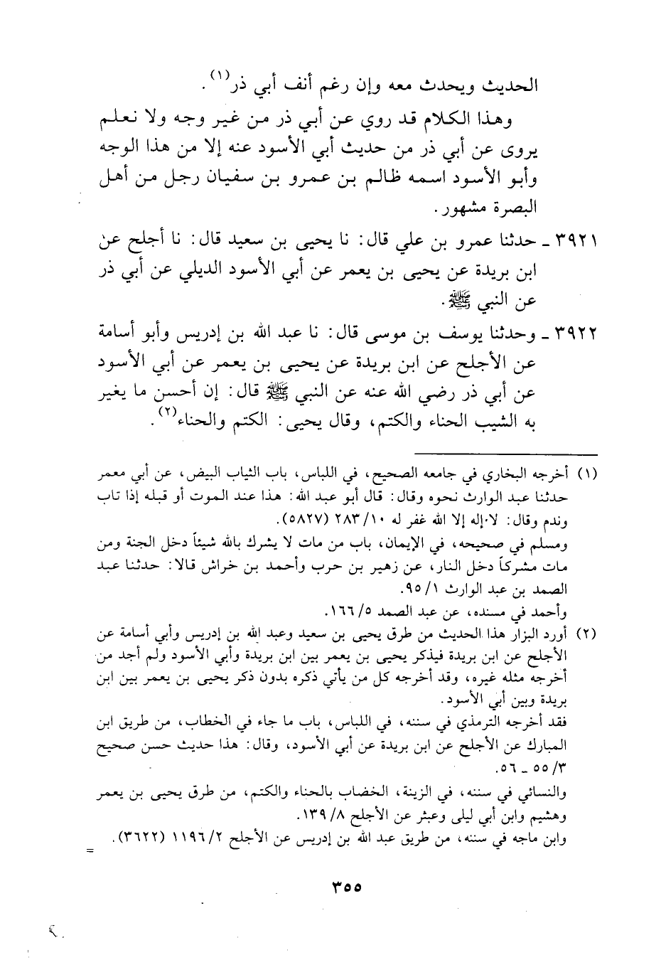 3922 - وَحَدَّثَنَا يُوسُفُ بْنُ مُوسَى، قَالَ: نَا عَبْدُ اللَّهِ بْنُ إِدْرِيسَ، وَأَبُو أُسَامَةَ، عَنِ الْأَجْلَحَ، عَنِ ابْنِ بُرَيْدَةَ، عَنْ يَحْيَى بْنِ يَعْمَرَ، عَنْ أَبِي الْأَسْوَدِ، عَنْ أَبِي ذَرٍّ، رَضِيَ اللَّهُ عَنْهُ، عَنِ النَّبِيِّ صَلَّى اللهُ عَلَيْهِ وَسَلَّمَ، قَالَ: «§إِنَّ أَحْسَنَ مَا يُغَيَّرُ بِهِ الشَّيْبُ الْحِنَّاءُ وَالْكَتَمُ» وَقَالَ يَحْيَى: الْكَتَمُ وَالْحِنَّاءُ